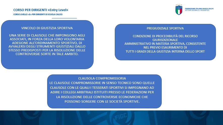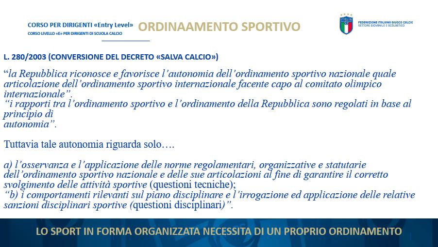 Successivamente il Dott. Gianluigi Ancona, Responsabile Organizzativo CFT Ceglie Messapica e AST Brindisi, ha introdotto la relazione attraverso la visualizzazione di alcune slide partendo dalla definizione di "Ordinamento Sportivo" e dei soggetti regolati da principi e criteri uniformi a livello mondiale: "L'Ordinamento Sportivo si rifà ai principi disciplinati dal CIO e deve adeguarsi all'ordinamento statale. La legge italiana che regolamenta l'ambito di applicazione dell'ordinamento sportivo è la Legge n.280/2003 (Conversione del Decreto "Salva Calcio") che definisce e regola i principi di autonomia che riguardano l'aspetto tecnico e disciplinare. Attraverso questa legge vengono definiti alcuni principi fondamentali come la pregiudiziale sportiva, il vincolo di giustizia e la clausola compromissoria".