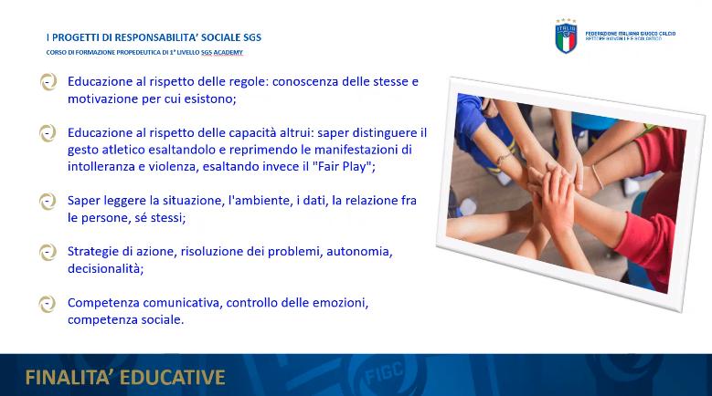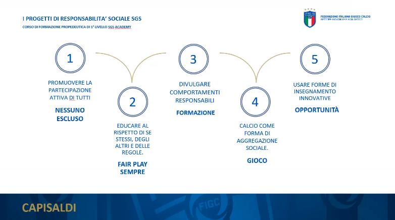 Nell'ambito del progetto "SGS Academy Puglia" si è svolto lunedì 3 maggio 2021, il webinar dal titolo "I progetti di responsabilità sociale del Settore Giovanile e Scolastico" afferente al secondo ciclo del Corso di Formazione Propedeutica Interna di Primo Livello "Entry Level" organizzato dal Settore Giovanile e Scolastico della Regione Puglia e riservato a tutti i collaboratori del territorio pugliese.