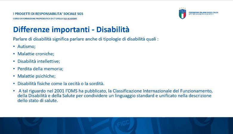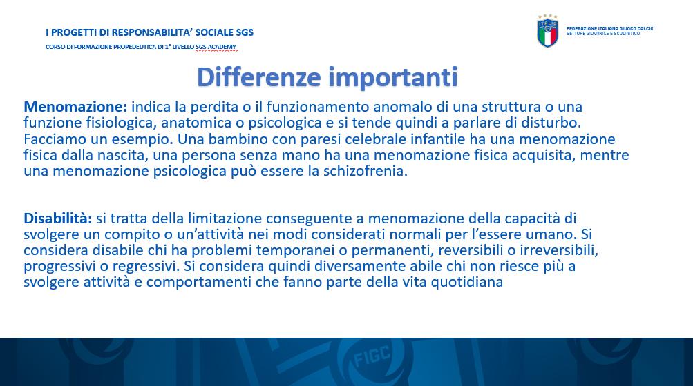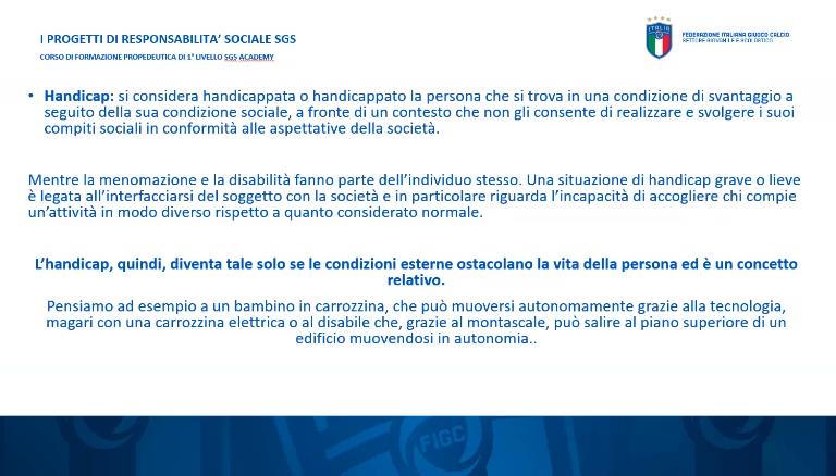 Nell'ambito di un ulteriore progetto di responsabilità sociale il "Calcio Integrato" il Referente SGS Academy Puglia, la Dott.ssa Valentina Leoncini, definisce i differenti termini di "menomazione", "disabilità" e "handicap" per ridurre tutte quelle condizioni che ostacolano la corretta integrazione del disabile all'interno di ogni contesto consentendo il fiorire di ogni potenzialità.