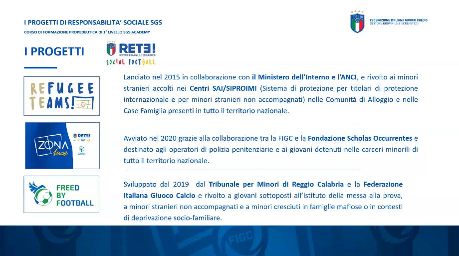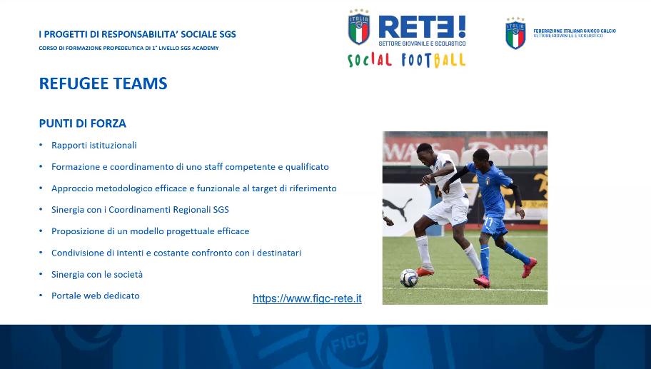 Subito dopo la Psicologa Regionale Ilaria Fischetti mostra attraverso alcune slide un altro progetto di responsabilità sociale, l' "Area Social Football" del Settore Giovanile e Scolastico creata nel 2020 con l'obiettivo di strutturare in maniera organica a livello nazionale un'attività che possa dare sempre una maggiore valenza al tema del sociale. Sono compresi tre progetti "Refugee Teams", "Zona Luce" e "Freed By Football".