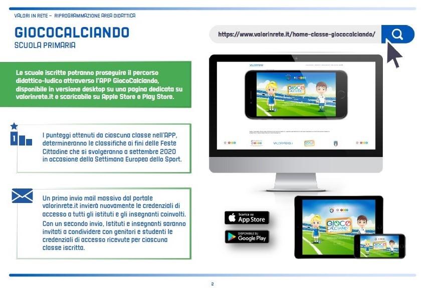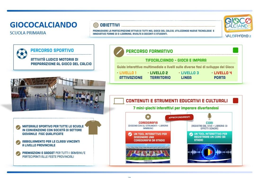 "GiocoCalciando" rientra tra i progetti del macro progetto nazionale didattico-sportivo "Valori in Rete" promosso dal Settore Giovanile e Scolastico della Federazione in collaborazione con il MIUR ed è rivolto alle Scuole Primarie del territorio per promuovere la partecipazione attiva di tutti nel gioco del calcio utilizzando nuove tecnologie e innovative forme di e-learning.