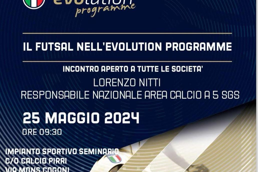 Sabato 25 Maggio 2024 dalle ore 09:30 alle ore 13:00 alla presenza del Responsabile Nazionale dell’area Calcio a 5 SGS Lorenzo Nitti, presso l’impianto sportivo Seminario (via Mons. Cogoni a Cagliari), l’incontro "Il Futsal nell’Evolution Programme".