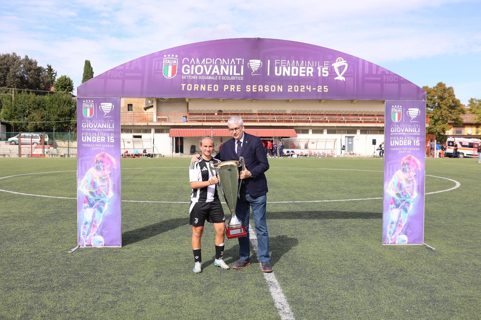 E' la formazione di Lombardo ad aggiudicarsi il torneo pre season Under 15 Femminile 2024-2025. Nella finalissima, disputata ieri presso il 'Fabio Frullini' di Chiusi, le giovani bianconere hanno avuto la meglio sulle coetanee del Milan, vincendo per 1-0 e ricevendo il primo trofeo della stagione dal Presidente del Settore Giovanile e Scolastico, Vito Tisci. Nella prima gara della giornata, valida per il terzo e quarto posto, l'Inter supera l'Atalanta 5-3 dopo i calci di rigore.
