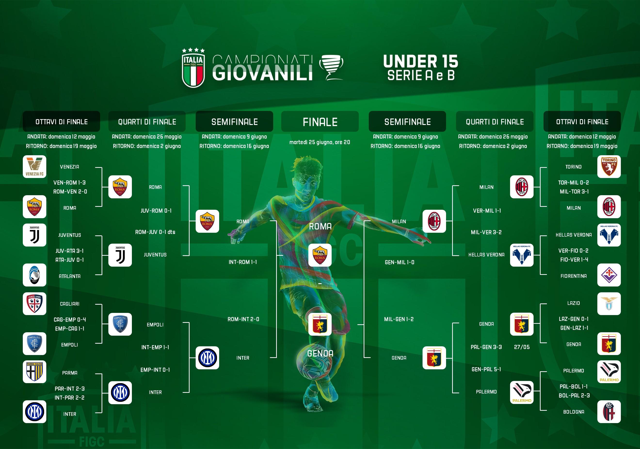 Le Finali Giovanili TIM sono pronte a vivere un altro entusiasmante capitolo, l'ultimo delle formazioni di Serie A e B, con la finale scudetto Under 15, in programma domani (ore 20, diretta DAZN e Vivo Azzurro TV) allo stadio 'Cino e Lillo Del Duca' di Ascoli Piceno, tra Genoa e Roma, le stesse società che si sono affrontate nell'atto finale dell'Under 18 (conclusosi con la vittoria dei rossoblù ad Ancona). I giallorossi cercano il loro settimo titolo italiano in categoria mentre i rossoblù si cimenteranno nella loro prima finale. In panchina, affascinante duello tra figli d'arte: da una parte Mattia Scala, figlio del Club Manager giallorosso Vito, e dall'altra Jacopo Sbravati, figlio del responsabile del settore giovanile rossoblù Michele, entrambi alla loro prima finale in assoluto nei Campionati Giovanili.