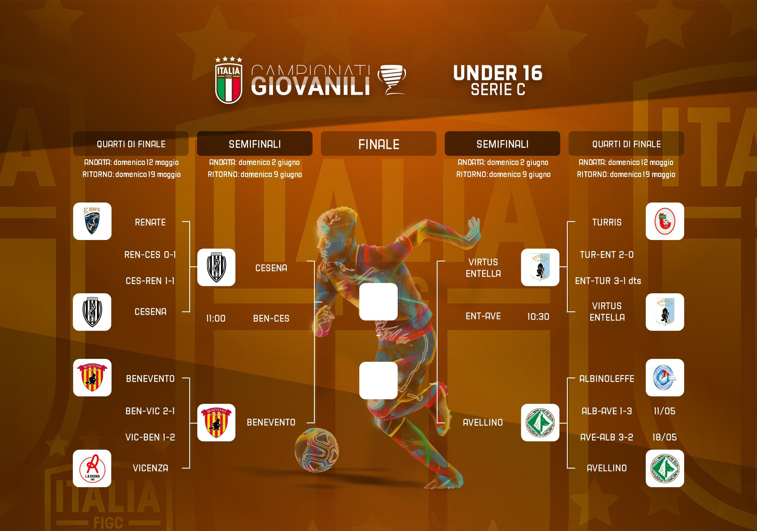 La fase finale del campionato Under 17 di Serie C entra nel vivo con le gare d'andata dei quarti che vedranno impegnate le otto migliori squadre della categoria. Tra le sfide in programma domenica 2 giugno, spiccano Albinoleffe-Renate e Pro Vercelli-Cesena, con i piemontesi forti dell'eliminazione dei campioni in carica del Vicenza. Si giocano l'accesso al turno successivo le formazioni del torneo Under 15, in campo per il ritorno dei quarti di finale, con Arezzo e Virtus Francavilla che nei match della scorsa settimana hanno già compiuto un bel passo verso la qualificazione. Ma l'attenzione maggiore sarà dedicata alle semifinali del campionato Under 16, con Benevento, Cesena, Avellino e Virtus Entella che si giocheranno l'accesso alla finale in programma il prossimo 23 giugno allo 'Stadio Bruno Recchioni' di Fermo.