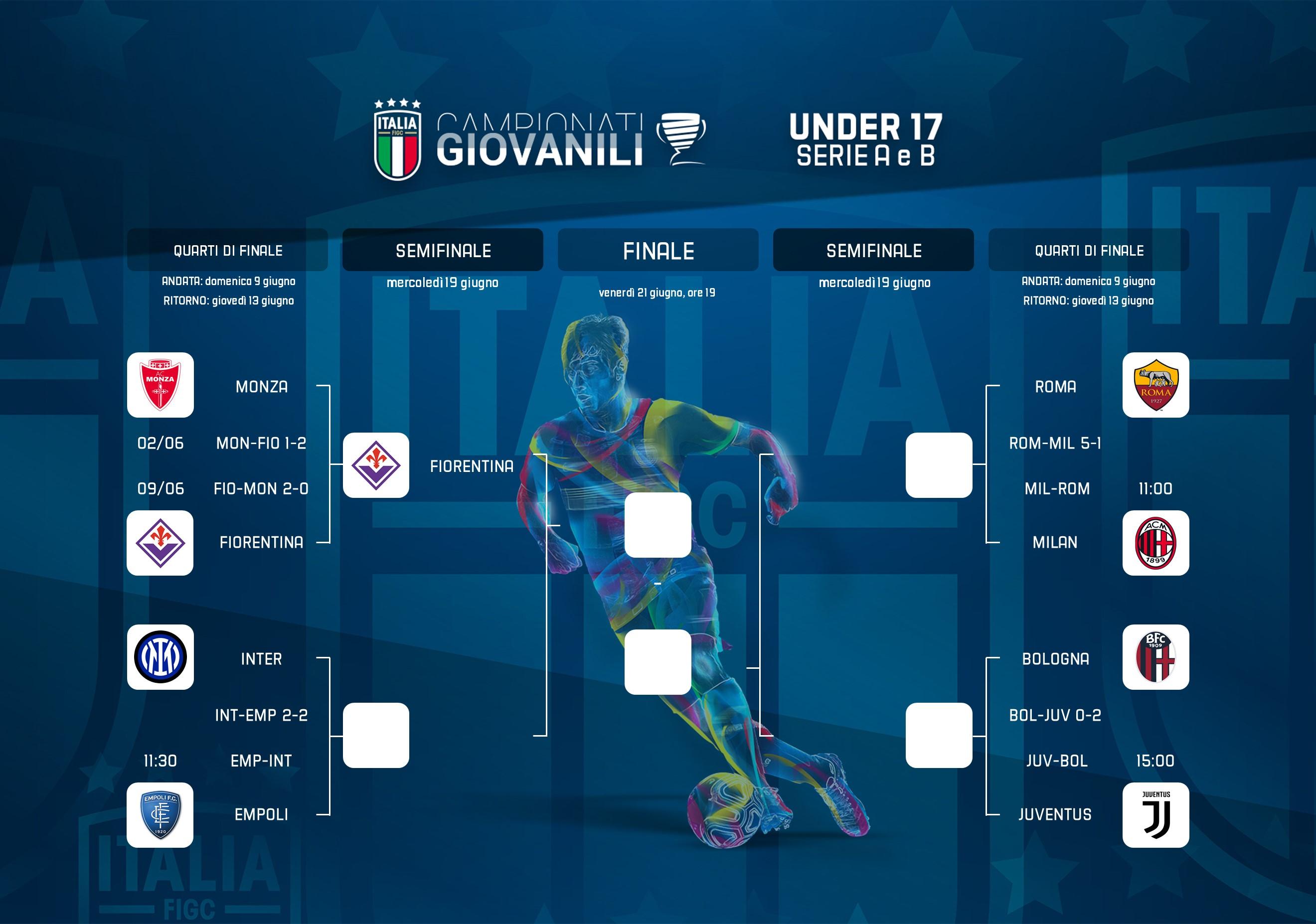 Nel ritorno dei quarti di finale del campionato Under 17, l'Inter di Tiziano Polenghi andrà a far visita all'Empoli di Andrea Filippeschi, dopo aver pareggiato 2-2 all'andata. Impegno casalingo anche per il Milan di Giovanni Renna, che ospiterà al 'Vismara' i campioni in carica della Roma, allenati da Gianluca Falsini, nella speranza di provare a ribaltare il pesante 5-1 incassato domenica a Trigoria. Infine, il Bologna di Denis Biavati, dopo il 2-0 incassato all'andata, andrà a far visita a Vinovo alla Juventus di Claudio Rivalta. Turno di riposo, invece, per la Fiorentina, che domenica ha conquistato la qualificazione alle semifinali ai danni del Monza.