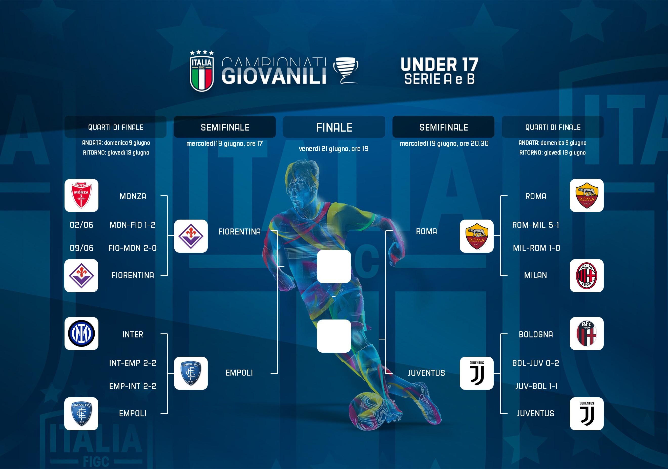 Saranno Fiorentina-Empoli e Roma-Juventus le semifinali della fase finale a 4 del campionato Under 17, in programma mercoledì 19 giugno rispettivamente al 'Cino e Lillo Del Duca' di Ascoli (ore 17) e al Del Conero di Ancona (ore 20.30): entrambe saranno trasmesse in diretta su DAZN e Vivo Azzurro TV.