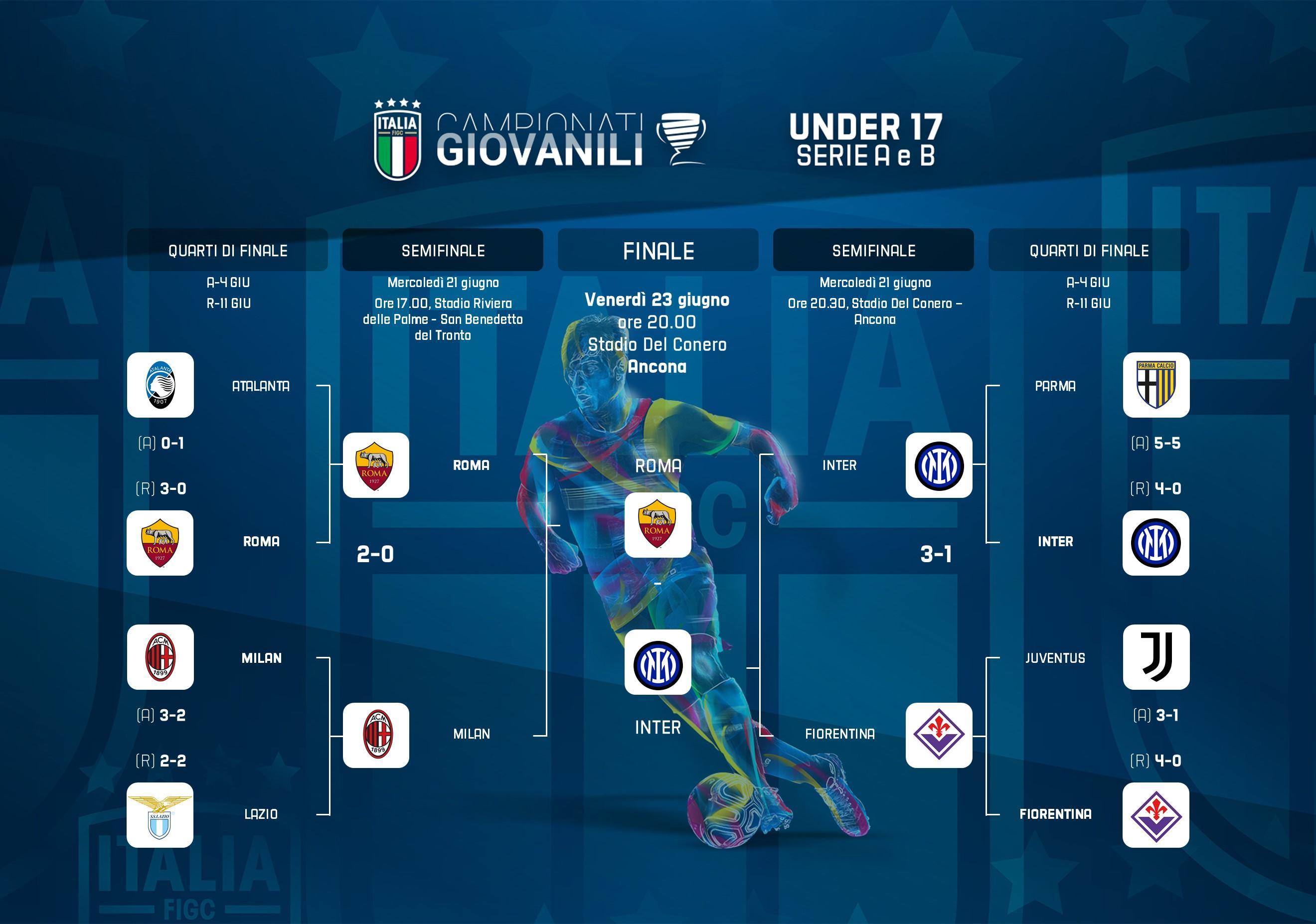 Due finali nelle Marche per la Roma, addirittura tre per l'Inter. A giocarsi lo scudetto Under 17 Serie A e B saranno due delle grandi protagoniste delle Finali Giovanili TIM. Il titolo dei 2006 si assegna domani, venerdì 23 giugno, allo stadio del Conero di Ancona, con calcio d'inizio alle 20 e diretta su DAZN e figc.it. Per l'Inter è la seconda finale dopo quella persa contro la Spal in Under 18 e che precede di 24 ore quella Under 15 contro l'Empoli a Fermo; la Roma, invece, giocherà per il tricolore anche con l'Under 16, lunedì a San Benedetto del Tronto contro la Fiorentina.