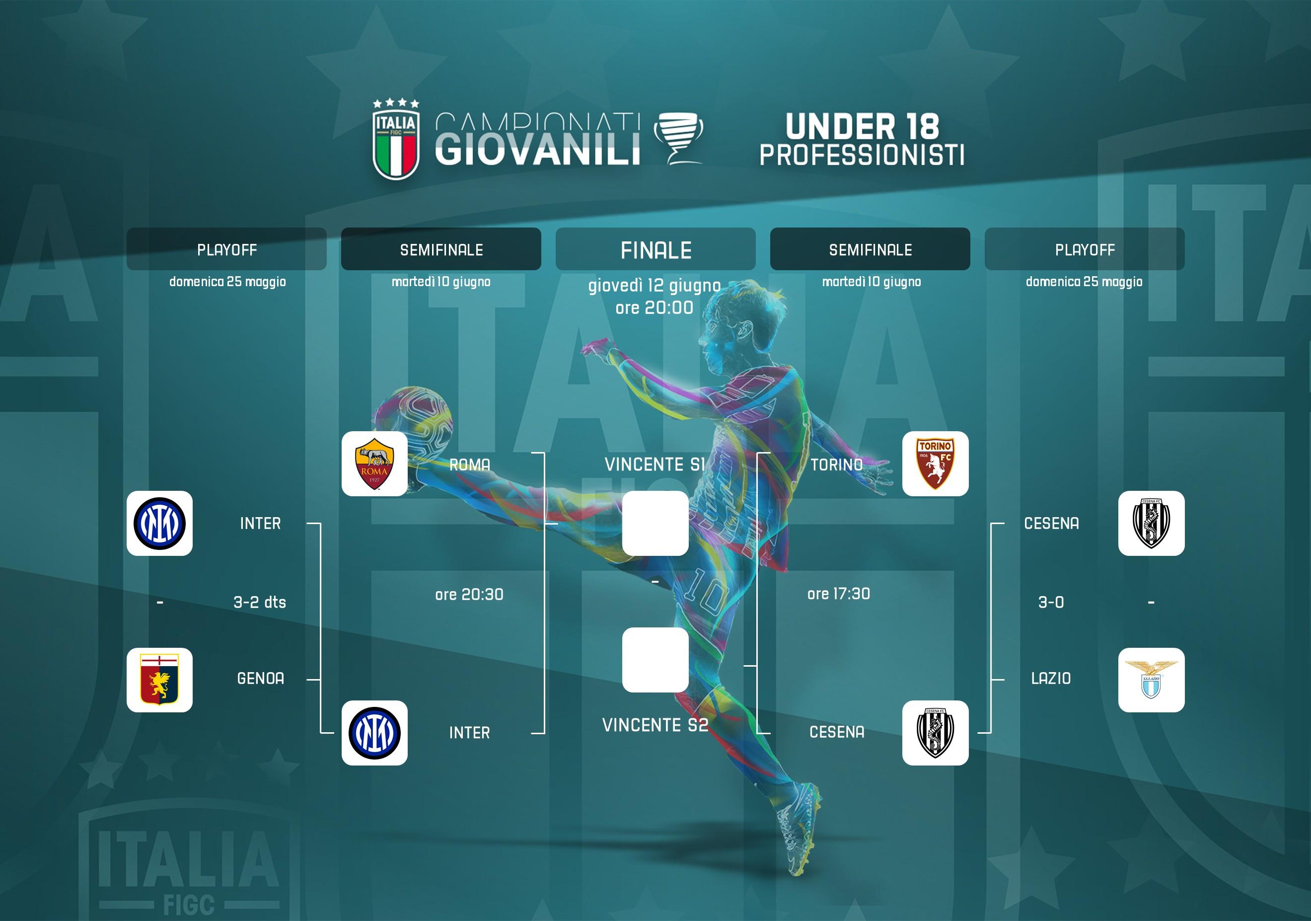 Si alza il sipario sulle Finali Giovanili TIM. Oggi, martedì 10 giugno, parte ufficialmente la corsa allo scudetto del Campionato Nazionale Under 18 Professionisti, con le semifinali della fase finale a 4. Si comincia nel pomeriggio (ore 17.30, diretta streaming esclusiva su Vivo Azzurro TV) allo Stadio 'Domenico Francioni' di Latina con la sfida tra Torino e Cesena. In serata (ore 20.30, diretta streaming esclusiva su Vivo Azzurro TV), fari puntati sullo Stadio 'Benito Stirpe' di Frosinone per il big match tra Roma e Inter. Due partite da dentro o fuori, due pass per la finalissima, in programma giovedì 12 giugno (ore 20.00, diretta streaming esclusiva su Vivo Azzurro TV) allo Stadio 'Domenico Francioni' di Latina.