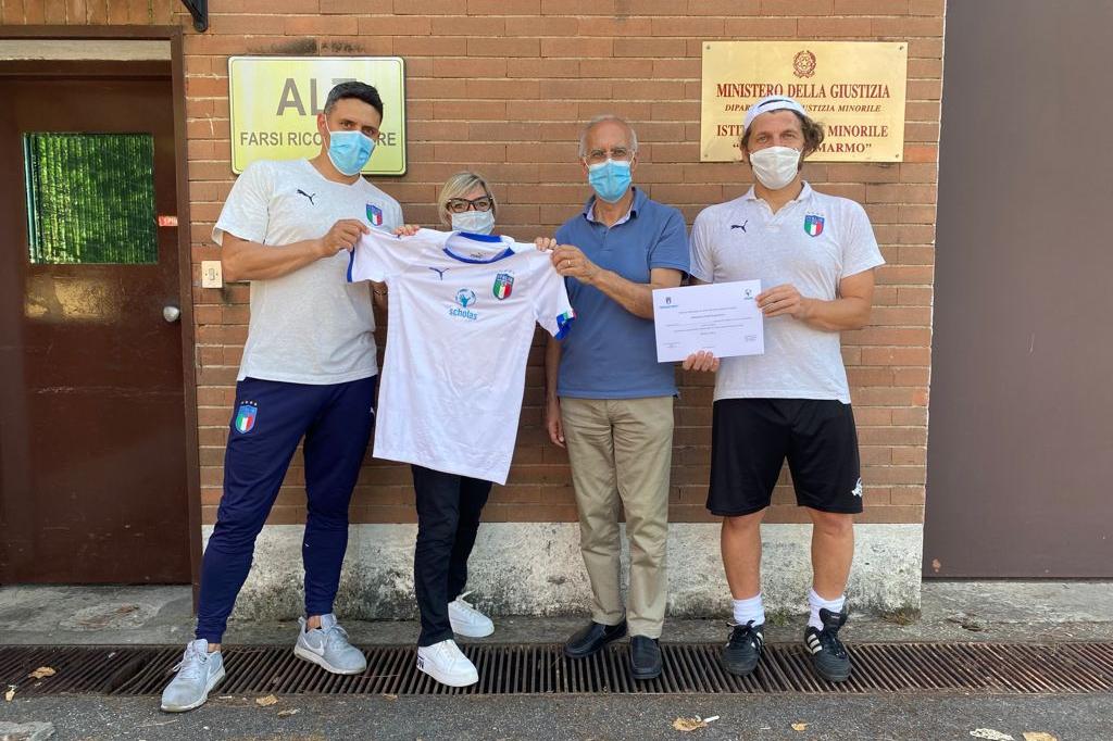 Dopo le dieci sessioni di carattere tecnico, coordinate dalla struttura regionale SGS e la collaborazione degli istruttori di Scholas, i nove giovani beneficiari coinvolti nell’attività negli ultimi mesi hanno ricevuto l’attestato di partecipazione al progetto, alla presenza di Mario Del Verme Responsabile per lo Sport di Scholas Italia, Vanessa Sana, operatrice dell’Istituto, Nicolò Ceccolini, il cappellano della struttura, dello staff SGS del Lazio rappresentato da Valerio Troiani, referente FIGC SGS del progetto, e da Gianluca Lombardi, tecnico Scholas nell’ambito del team formativo, in una giornata che ha rappresentato il termine di un progetto, ma la prospettiva concreta al passaggio al mondo del calcio giovanile, l’Istituto di Casal del Marmo ha ricevuto.