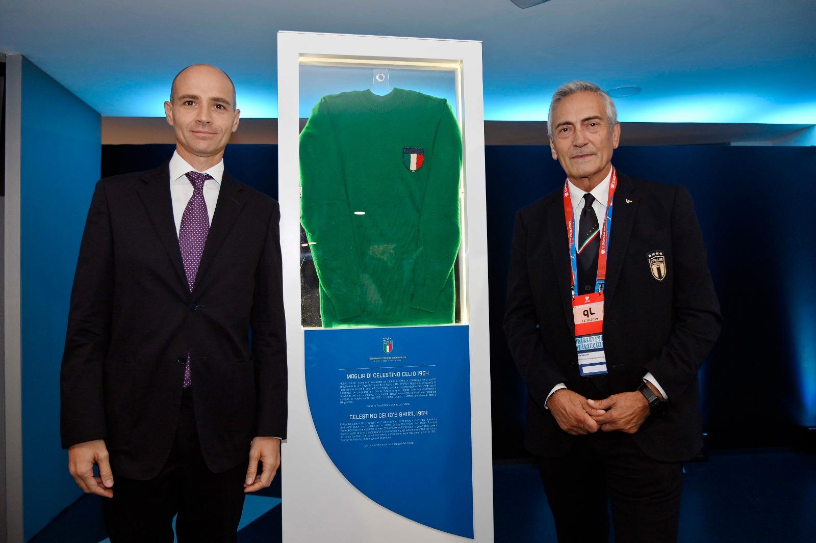 Di diverse epoche i 18 cimeli esposti per l’occasione: si va dalla maglia indossata da Giovanni Ferrari nel Mondiale vinto dall’Italia nel ’34, a quella di Fabio Cannavaro nel Mondiale di Germania 2006, dagli scarpini con cui Silvio Piola ha trascinato nel ’38 la Nazionale verso la seconda Coppa del Mondo, alla maglia indossata da Francesco Totti nell’Europeo del 2000, quello del famoso ‘cucchiaio’ nella semifinale con l’Olanda. C’è anche una maglia verde, come quella che l’Italia indosserà domani sera nel match con la Grecia. Si tratta della casacca numero 8 sulle spalle di Celestino Celio in occasione della partita amichevole Italia-Argentina, giocata proprio a Roma il 5 dicembre 1954.