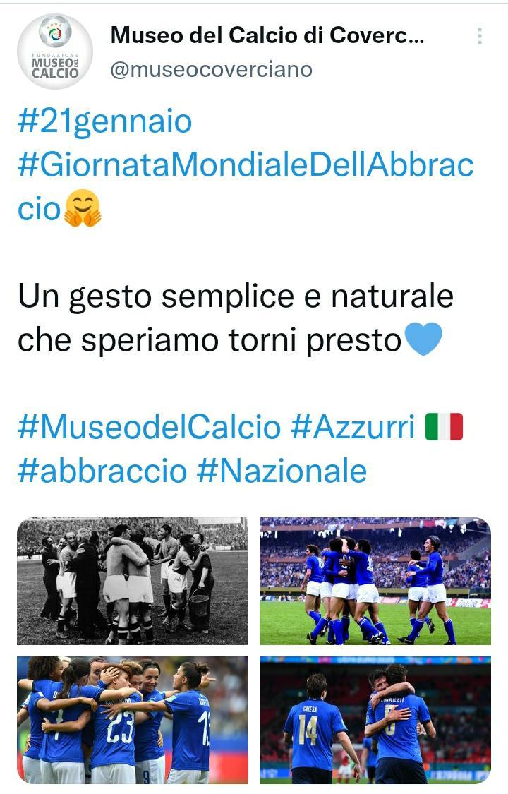 Il Museo del Calcio celebra, oggi 21 gennaio, la Giornata mondiale degli Abbracci sui suoi canali social con le immagini di abbracci Azzurri nella storia e nel presente. In particolare, quelli legati ad Euro 2020, al Mondiale femminile 2019, al Mondiale 1978 e al Mondiale 1938. Scatti che oltrepassano il tempo accompagnati dalla frase: "Un gesto semplice e naturale che speriamo torni presto".