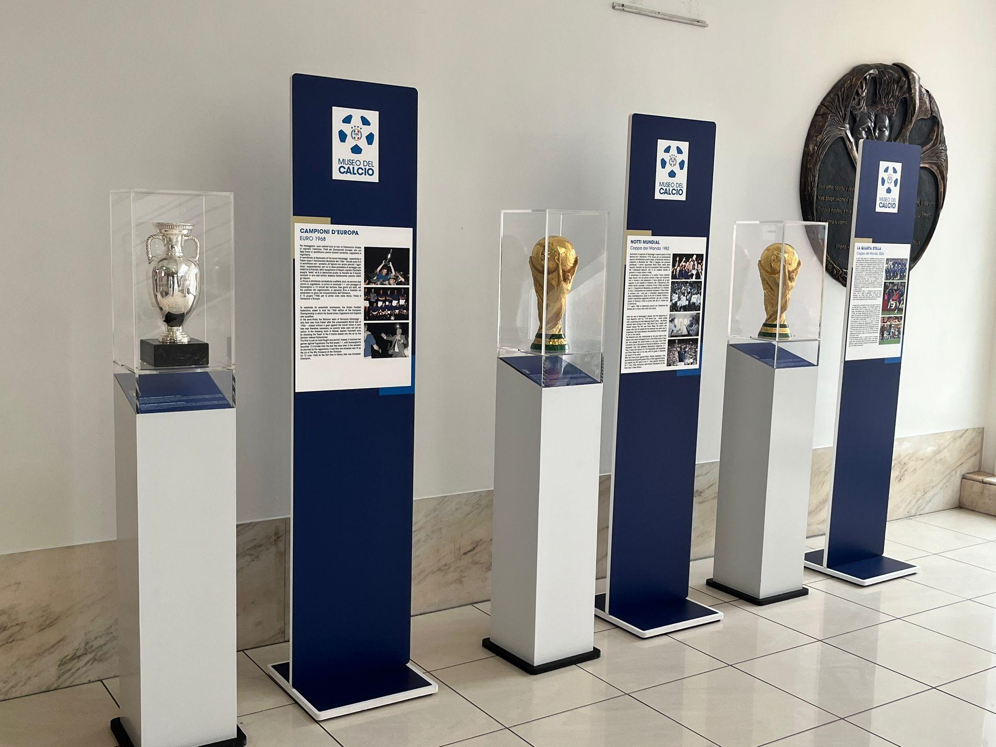 TROFEI AZZURRI. La mostra racconta in parallelo la storia e le più belle vittorie della Nazionale maggiore maschile insieme a quelli delle Nazionali giovanili azzurre, grazie ad una selezione di cimeli della collezione del Museo di Coverciano. Dal trionfo europeo del 1968, con la maglia di Sandro Salvadore, fino al successo di EURO 2020 con la coppa alzata al cielo dai ragazzi di Roberto Mancini a Wembley, l’esposizione ripercorre la storia degli Azzurri dal dopoguerra fino ai giorni nostri. Presenti anche i trionfi mondiali del 1982 e del 2006 celebrati con la maglia di Fulvio Collovati di Spagna ’82 e il pallone della finale di Berlino.