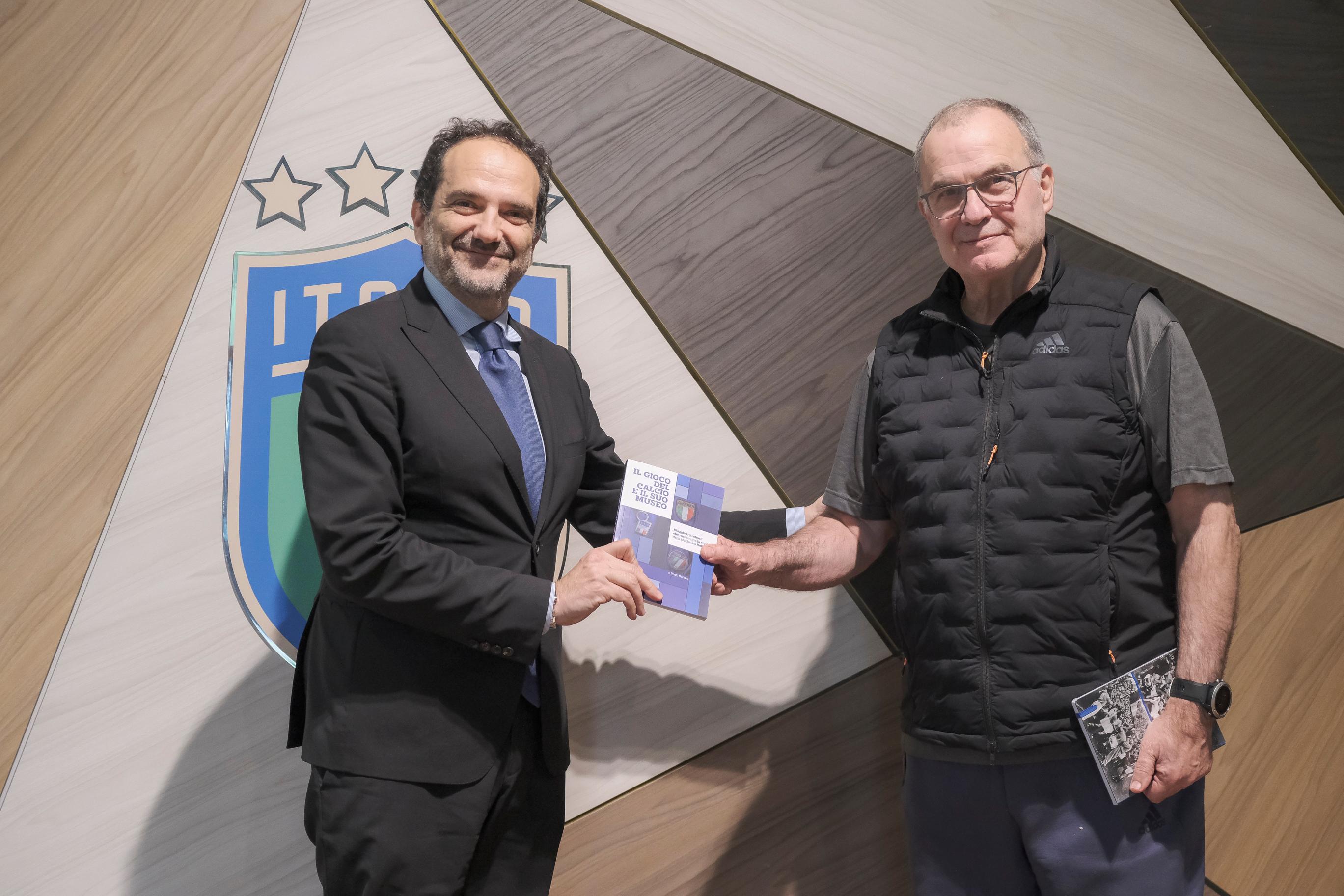 Quindi l’incontro con il presidente della Fondazione Museo del Calcio, Matteo Marani, che ha donato allo stesso Bielsa il catalogo del museo, il volume che raccoglie le maglie, i trofei e gli oggetti presenti all’interno della struttura, in un racconto che scorre attraverso oltre un secondo di storia dell’Italia calcistica.