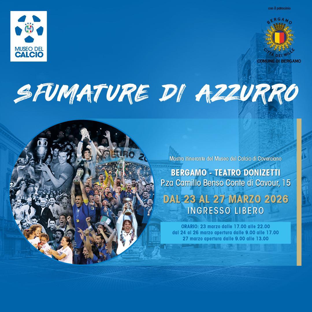 Sarà la città di Bergamo - in occasione della semifinale dei play-off mondiali tra Italia e Irlanda del Nord (giovedì 26 marzo, ore 20.45) - a ospitare la nuova tappa di ‘Sfumature d’Azzurro’, la mostra itinerante che racconta la storia delle Nazionali italiane attraverso una selezione di cimeli della collezione del Museo del Calcio di Coverciano. L’esposizione, che si terrà da lunedì 23 a venerdì 27 marzo all’interno del foyer del Teatro Donizetti, permetterà ai visitatori di rivivere i trionfi più significativi delle nostre Nazionali, offrendo la possibilità di ammirare da vicino le Coppe del Mondo e d’Europa alzate al cielo dagli Azzurri.