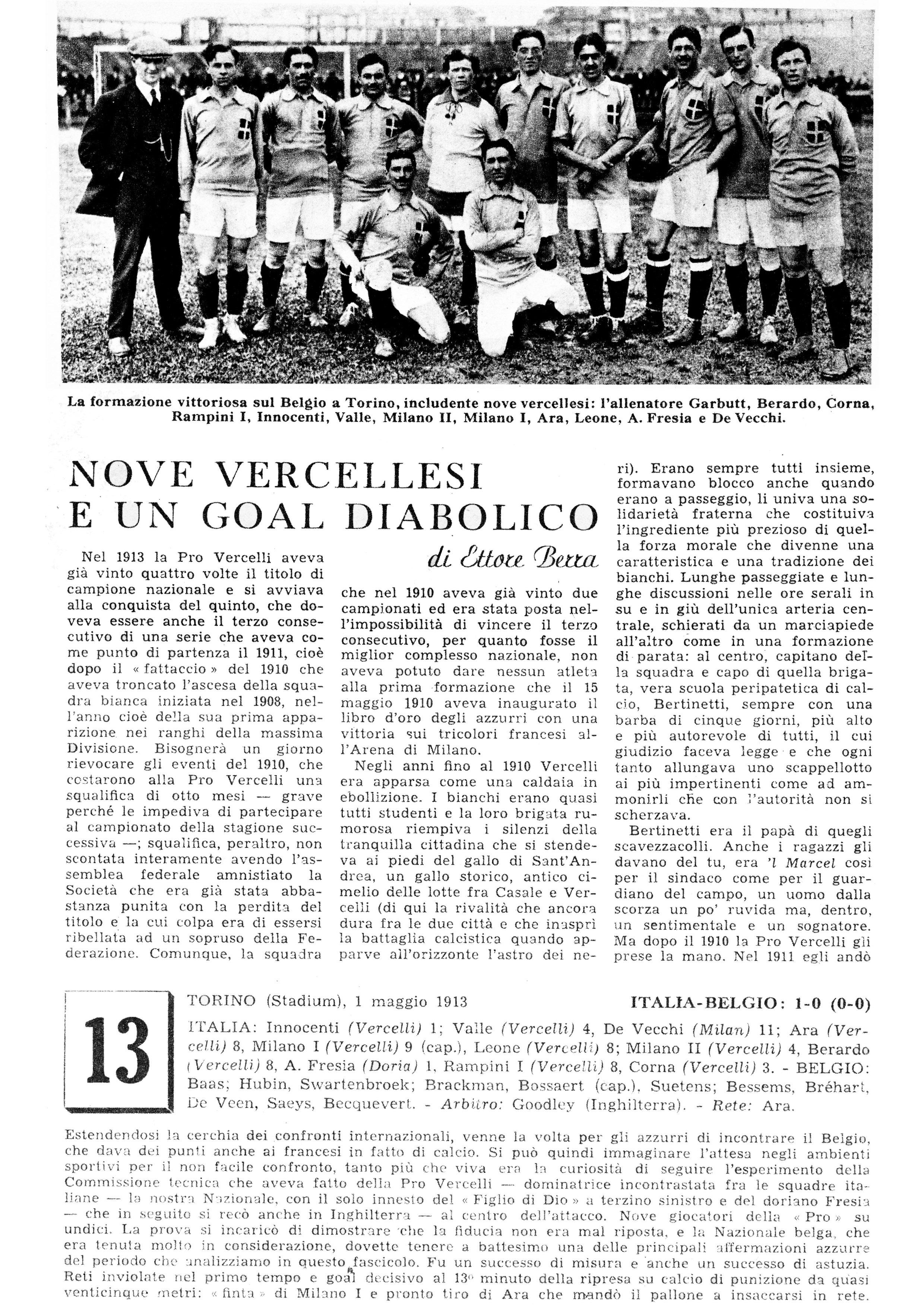 "La commissione – proseguono Bini e Cervelli - prese l'abitudine di nominare un trainer, che prima era stato un preparatore atletico (Meazza); il primo allenatore vero e proprio in questo ruolo sembra essere proprio Garbutt il 1° maggio 1913, quando l'Italia con nove vercellesi batte il Belgio 1-0 (A lato la cronaca riportata da "Storia del calcio illustrato").