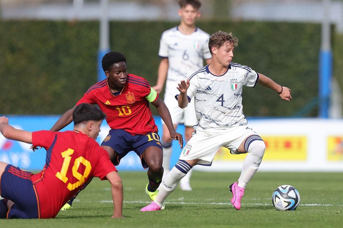 LA PARTITA. Rispetto all’amichevole di martedì Battisti cambia tutto l’undici iniziale, dando così spazio a chi non aveva giocato la prima gara. Al 12’ la Spagna si procura un calcio di rigore, ma Tommaso Mazzi (Fiorentina) riesce a parare il penalty calciato da Ruben Gomez. Il vantaggio degli iberici, però, è solo rimandato perché al 25’ il capitano Enzo Alves sblocca il risultato sfruttando un disimpegno errato della retroguardia azzurra. La sfida è equilibrata, l’Italia non si dà per vinta e sfiora nella ripresa il gol con i neoentrati Nana Jeffrey Baffoh (Sassuolo) e Samuele Pisati (Milan), quest’ultimo autore della rete del pareggio nella prima amichevole. Ma stavolta la rimonta non riesce.