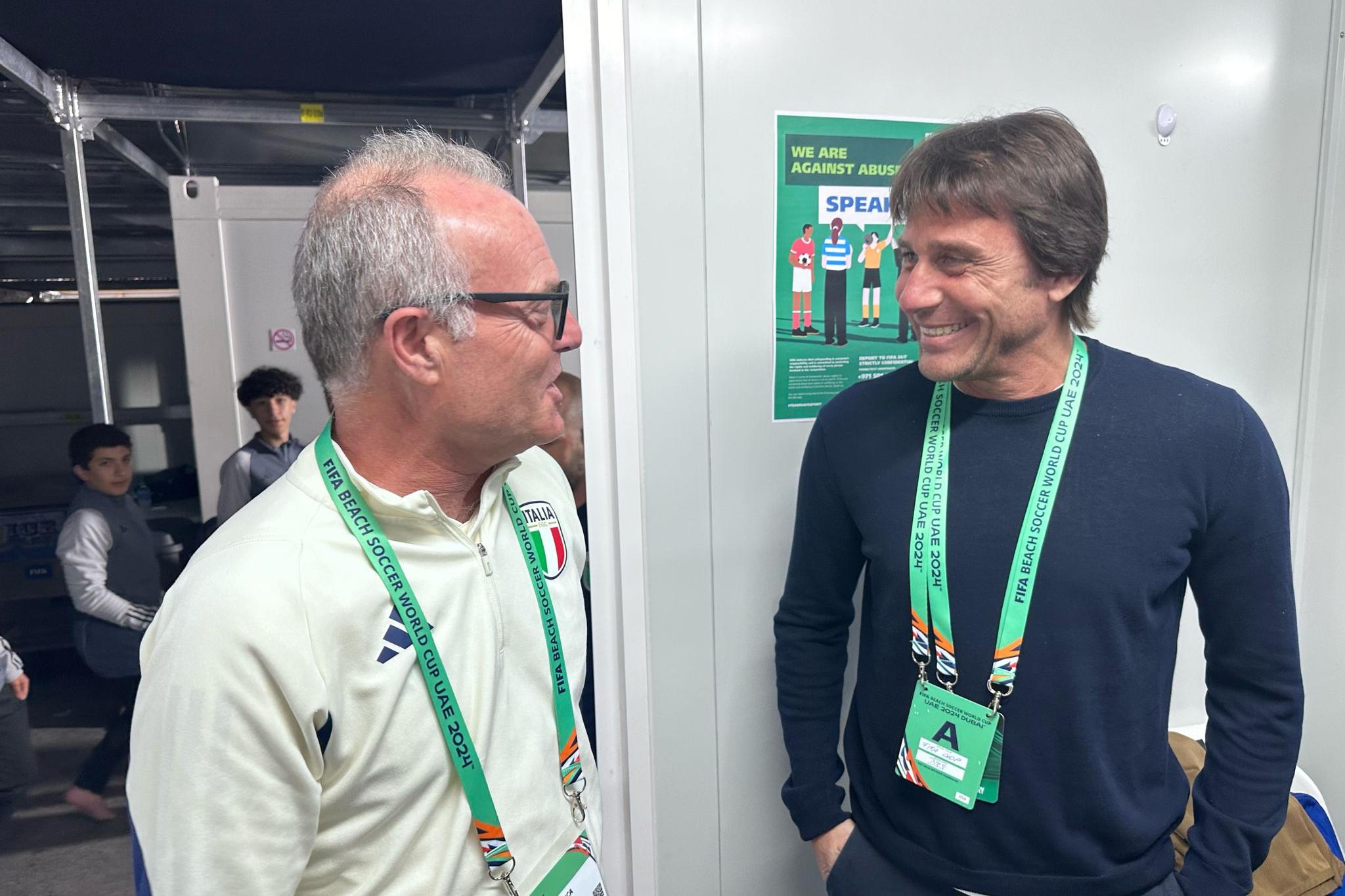 L’Azzurro come seconda pelle. Per Antonio Conte il rapporto con la Nazionale è qualcosa di speciale. 20 presenze con l’Italia da calciatore, 25 da commissario tecnico, un Amore con la ‘a’ maiuscola che l’ex Ct non smette mai di mostrare. Presente a Dubai a tifare per la Nazionale di beach soccer già in occasione dell’ultima gara del girone con gli Emirati Arabi, a pochi minuti dal calcio d’inizio del quarto di finale con Tahiti, la squadra ha ricevuto una piacevole sorpresa nello spogliatoio, un plus di motivazioni. Sorridente e anche emozionato, Conte ha salutato Zurlo e compagni e in punta di piedi, in un momento sempre delicato del prepartita, ha fatto loro l’in bocca al lupo: "Siamo tutti con voi, proveremo a spingervi anche dalle tribune, regalateci questo sogno" le sue parole.