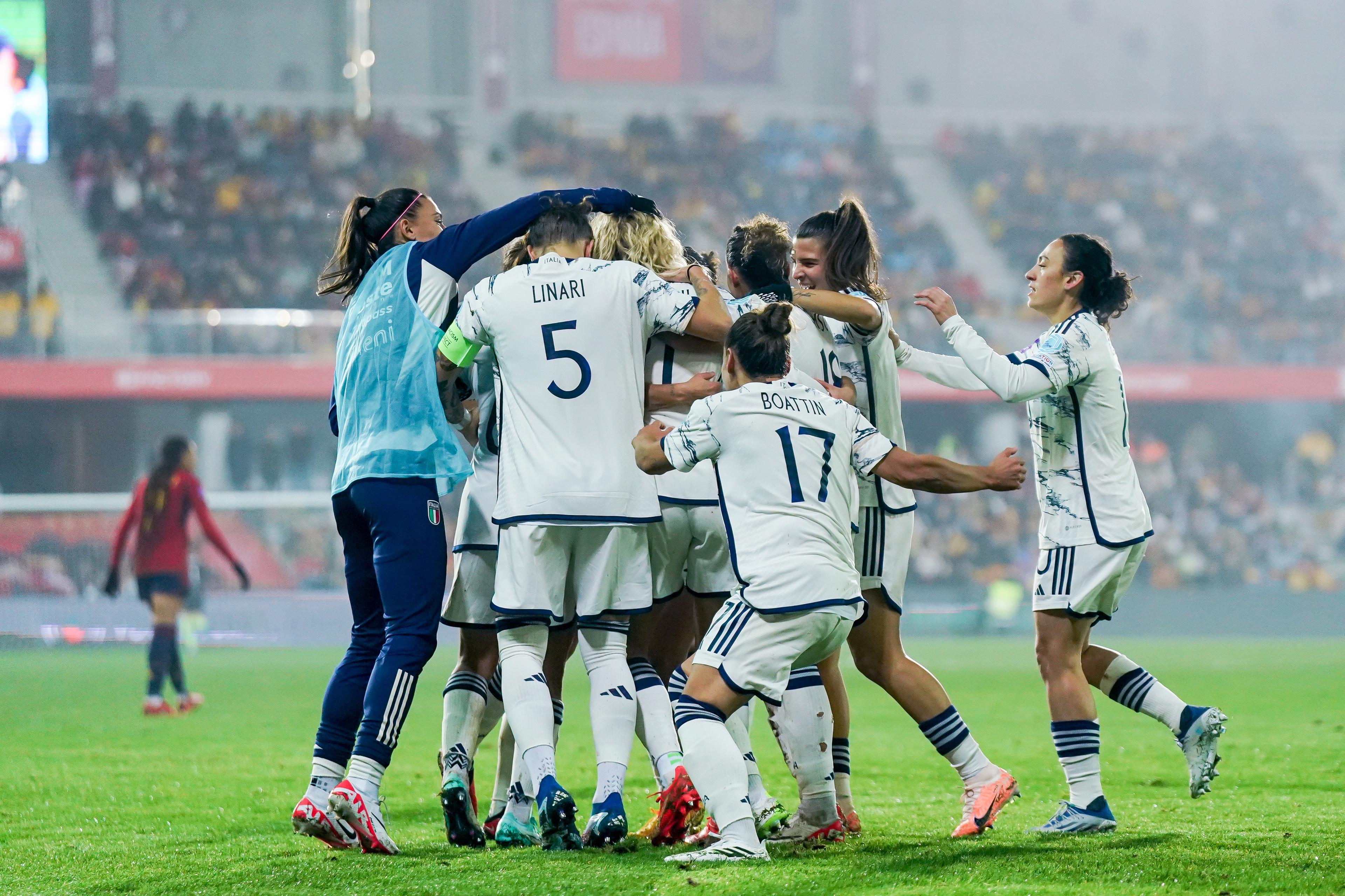 Un risultato storico, cercato, sofferto ma assolutamente meritato. L’Italia supera 3-2 la Spagna campione del mondo e festeggia questo straordinario successo sotto gli occhi dei 10mila spettatori dello stadio Pasaron di Pontevedra, increduli come le calciatrici di casa, travolte dal gioco e dal cuore delle Azzurre. Dopo lo svantaggio inziale, firmato da Athenea all’11’, nella ripresa la squadra di Soncin dilaga grazie alle reti di Giacinti, Cambiaghi e Linari. Il gol di Gonzalez permette alle Furie Rosse di credere nella contro-rimonta, ma di fronte a questa Italia c’era poco da fare.