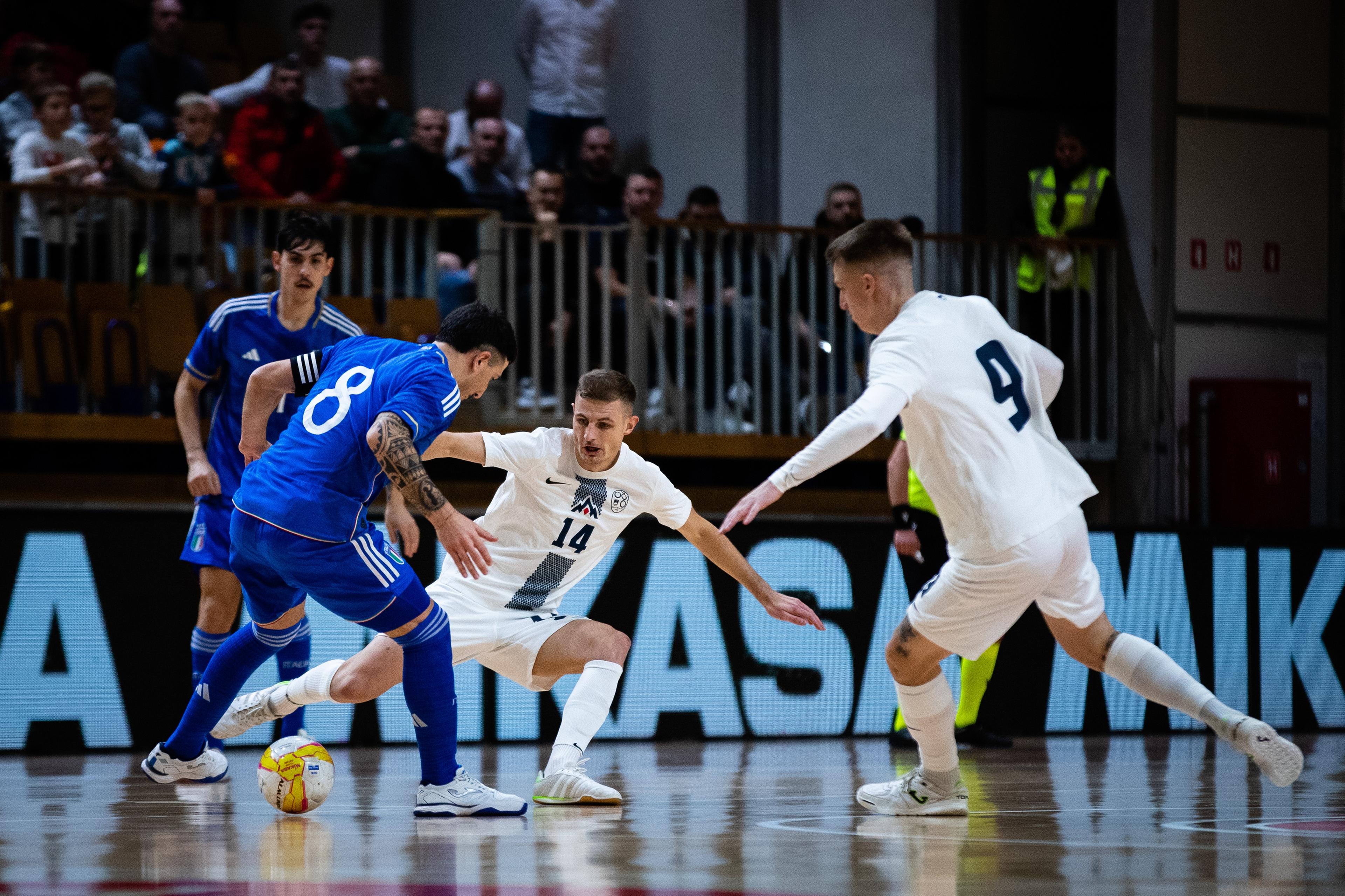 La partita. Bellarte parte con un quintetto ormai consolidato, con Pietrangelo fra i pali, Musumeci davanti a lui, e poi Donin, Motta e Merlim a completare lo starting five. L’approccio degli Azzurri è perfetto: dopo appena due minuti Musumeci si inventa un gol con una volée incredibile su lancio di Motta che vale l’1-0. Il vantaggio dà fiducia all’Italia che al 5’ va vicina al raddoppio con Calderolli e Isgrò due volte murati da Berzelak, l’estremo difensore dei padroni di casa. Non tarda però ad arrivare la risposta dei ragazzi di Horvat: Pietrangelo è perfetto nell’1vs1 con Hozjan, il calciatore che veste la maglia del Sandro Abate di Avellino. Il pari arriva al 7’, con Duscak che ruba palla a Isgrò in pressione servendo Bukovec per il comodo 1-1. La partita all’improvviso cambia: un minuto dopo il pari Merlim viene espulso per un contatto con Bukovec e l’Italia in un colpo solo è in inferiorità numerica perdendo anche il suo miglior giocatore. Gli Azzurri però sono strepitosi con l’uomo in meno difendendo perfettamente senza subire gol. Ristabilita la parità numerica, però, l’equilibrio nel punteggio viene rotto ancora da Bukovec che al 14’ chiude una perfetta giocata slovena con Berzelak salito come portiere di movimento. L’Italia crea un altro paio di buone situazioni, ma al riposo si gira sul 2-1 Slovenia.