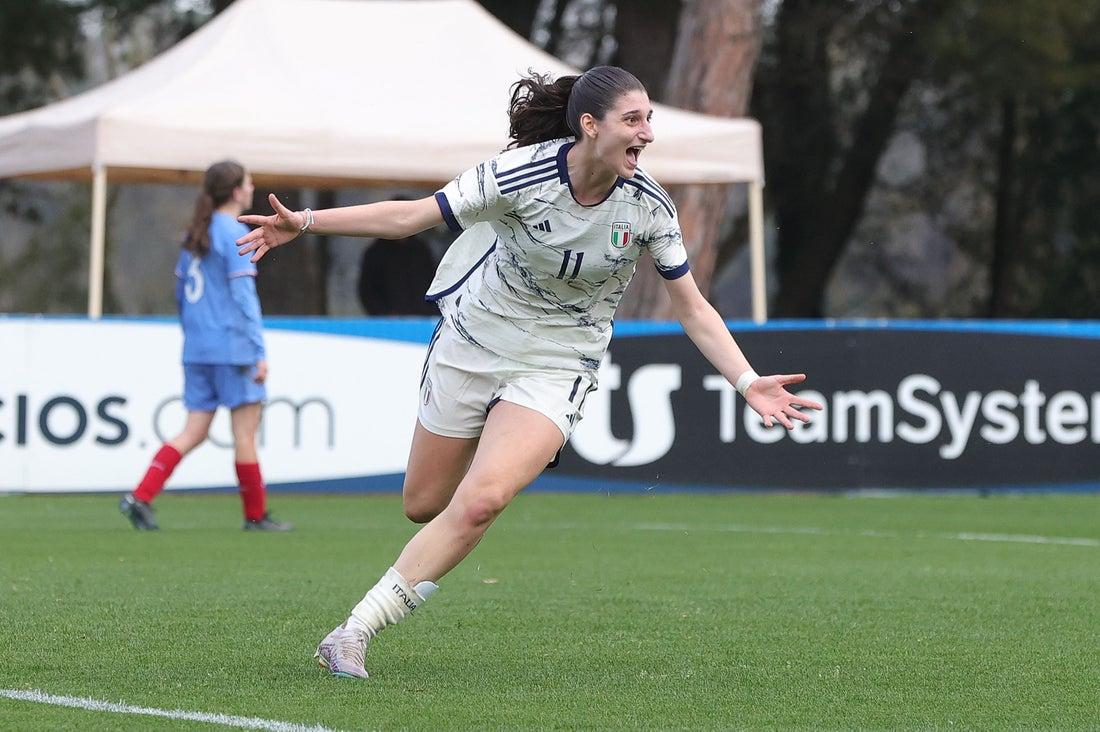 LA PARTITA. In un primo tempo scoppiettante è la Francia a partire forte, facendo valere una maggiore fisicità soprattutto nei due esterni d’attacco, Jeunot Gurrieri e Morissaint. Al palo colpito in apertura da Le Roux, l’Italia risponde con Sasso, entrata al 12’ al posto dell’infortunata Volpini e fermata in uscita dal portiere francese Lambert. Ma sono le Bleues a fare la partita e a trovare al 18’ il gol del meritato vantaggio con Jeunot Gurrieri, che sfrutta un disimpegno errato della difesa azzurra e da una trentina di metri fa partire un sinistro potente e preciso che si infila sotto l’incrocio dei pali. Poco dopo Nzaba in contropiede si divora il 2-0, calciando a lato da pochi passi a tu per tu con Sossai. L’Italia sembra alle corde, ma nel giro di quattro minuti ribalta il risultato: al 42’ pareggia con un bel sinistro a giro di Sasso, si vede quindi annullare per fuorigioco un gol di Montaperto e al 46’ trova il 2-1 con la stessa centrocampista del Milan, che si avventa sul pallone messo in mezzo da Stendardi e dall’altezza del dischetto sorprende sotto le gambe Lambert. È un’altra prodezza balistica a regalare alla Francia nel recupero del primo tempo il 2-2, con Le Roux che, complice il vento, va a segno direttamente da calcio d’angolo.