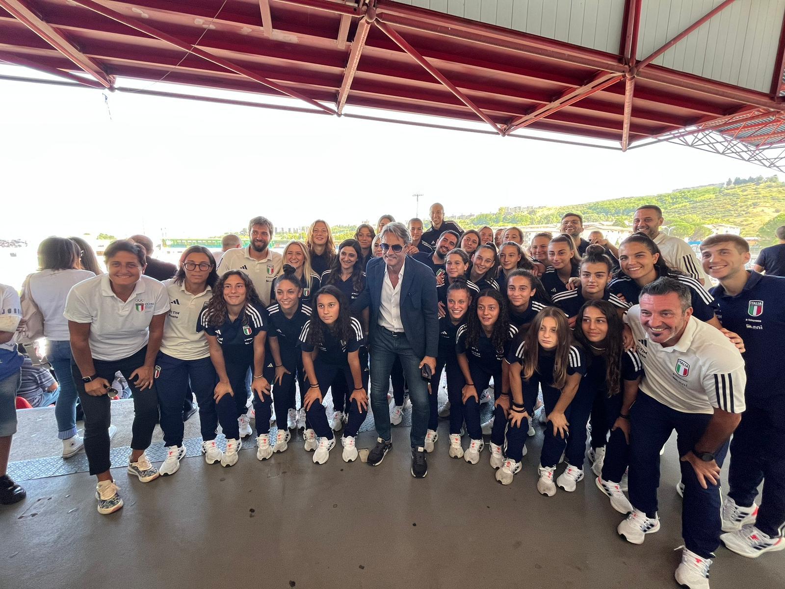 Squadra e staff, tutti visibilmente emozionati nel trovarsi protagonisti di questo momento di promozione dell'evento, hanno ricevuto l'in bocca al lupo del presidente del club, Eugenio Guarascio, e del presidente del Comitato Regionale Calabria della LND Saverio Mirarchi. Dopo aver assistito al primo tempo della partita, la squadra si è poi recata sul campo di allenamento di Rende, dove le Azzurrine erano state accolte in maniera altrettanto calorosa nei giorni scorsi, con un mazzo di fiori tricolore consegnato alla squadra.