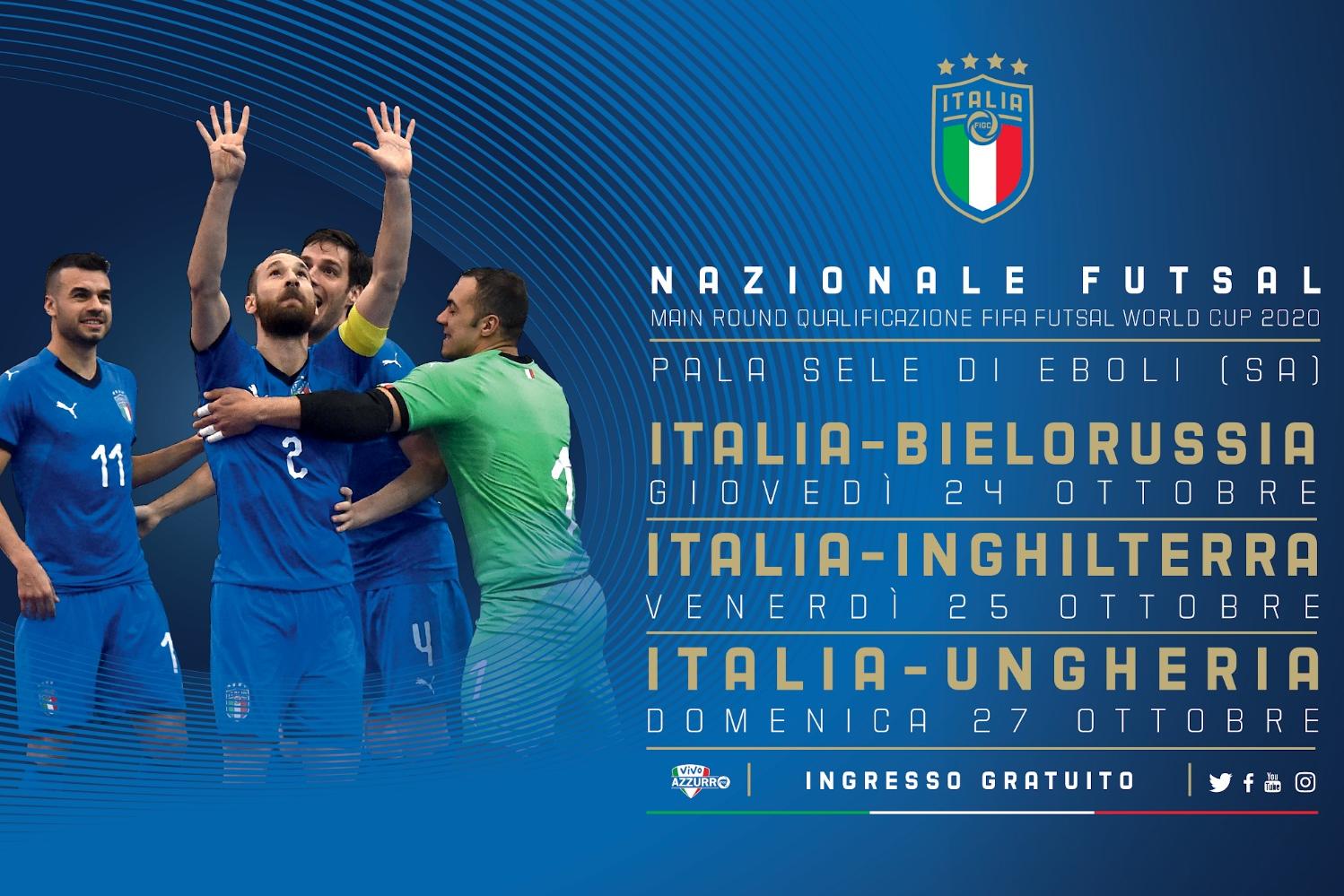 Sarà Eboli, in provincia di Salerno, a ospitare il Main Round di qualificazione alla Coppa del Mondo FIFA di futsal, in programma dal 24 al 27 ottobre. L’Italia affronterà - nell’ordine - Bielorussia, Inghilterra e Ungheria al Pala Sele, impianto limitrofo al PalaDirceu con una capienza di circa 8mila posti.