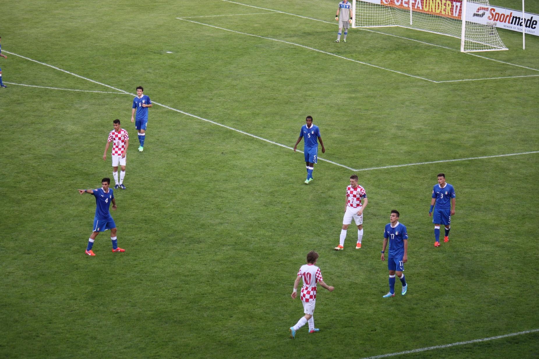 L’Italia scende in campo con un 4-4-2 con Scuffet tra i pali, linea difensiva da destra con Calabria, Sciacca, Capradossi e Dimarco, a centrocampo Palazzi e Pugliese con Tibolla a destra e Tutino a sinistra, in attacco Cerri e Bonazzoli. Corta, aggressiva e con un pressing molto alto, l’Under 17 parte bene e nei primi minuti di gioco crea diverse occasioni da rete. Al 2’ minuto episodio dubbio in area di rigore: Cerri viene atterrato da dietro da Prce ma l’arbitro lascia giocare. Al 9’ Italia vicino al vantaggio. Lancio di Pugliese per Bonazzoli il cui cross dalla destra viene involontariamente deviato dal difensore croato Prce: Maric deve superarsi per evitare l’autogol. Con il passare dei minuti viene fuori la Croazia, che inizia ad impensierire la difesa azzurra. Al 16’sfiora il vantaggio con Bodric, che vede respingersi il suo tiro a botta sicura da un intervento strepitoso di Scuffet. Portiere azzurro che si ripete sette minuti piu` tardi sulla conclusione di Roguljic, deviata in angolo. Al 22’ e` Bonazzoli, ben servito da Cerri, a non trovare la porta con un diagonale di sinistro. La ripresa inizia con una doppia occasione azzurra. Prima e` Cerri al 52’ a mancare la porta con una mezza rovesciata dall’interno dell’area; un minuto piu` tardi e` Bonazzoli che chiama ad un difficile intervento il portiere croato con un sinistro molto potente. Al 66’ e` ancora Scuffet a mantenere inviolata la porta azzurra, respingendo di piede una conclusione da pochi passi di Roguljic. Prima del fischio finale occasioni per il neo entrato Piu, il cui diagonale si spegne alla destra del portiere, e per Halinovic,che all’ultimo minuto di gioco chiama l’estremo difensore azzurro all’ultima fatica di giornata.