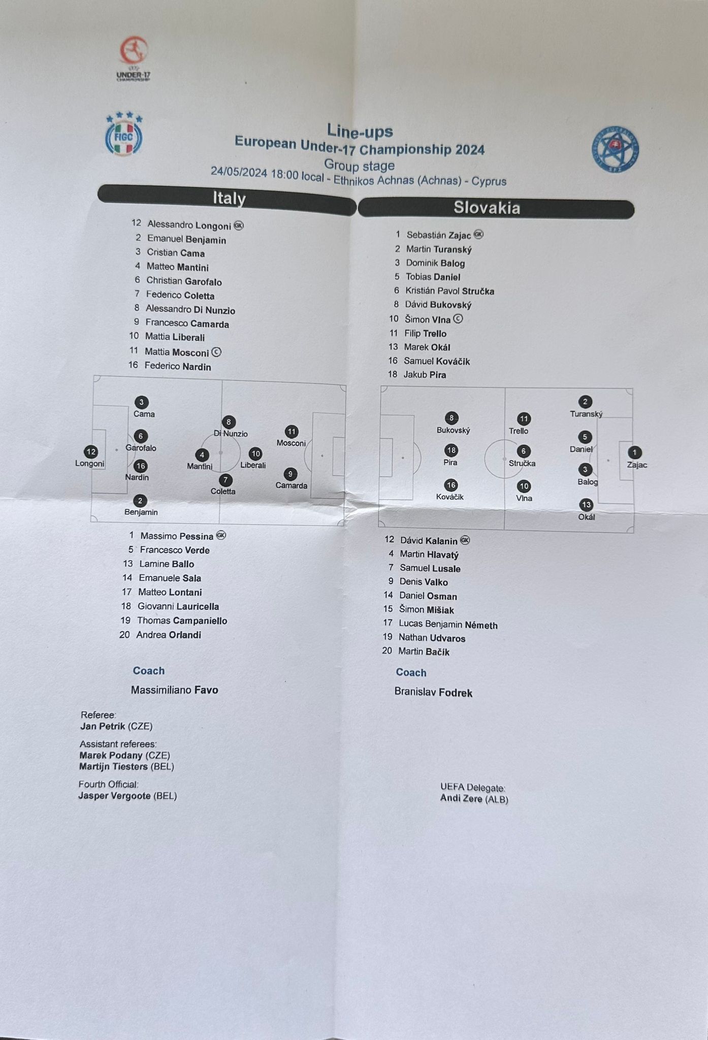 Splendido successo della Nazionale Under 17 che, vincendo 2-0 con la Slovacchia, ha conquistato aritmeticamente il 1° posto in classifica nel gruppo C, in virtù del pareggio 2-2 tra Svezia e Polonia nell'altra partita del girone, qualificandosi ai quarti di finale dell'Europeo con un turno di anticipo (dove affronteranno la seconda classificata del gruppo D composto da Francia, Inghilterra, Portogallo e Spagna). Gli Azzurrini, dopo essere passati in vantaggio con un gol da antologia di Francesco Camarda al 30', trovano la rete del raddoppio con Mattia Liberali al 38' chiudendo, di fatto, il discorso qualificazione nei primi 45 minuti.