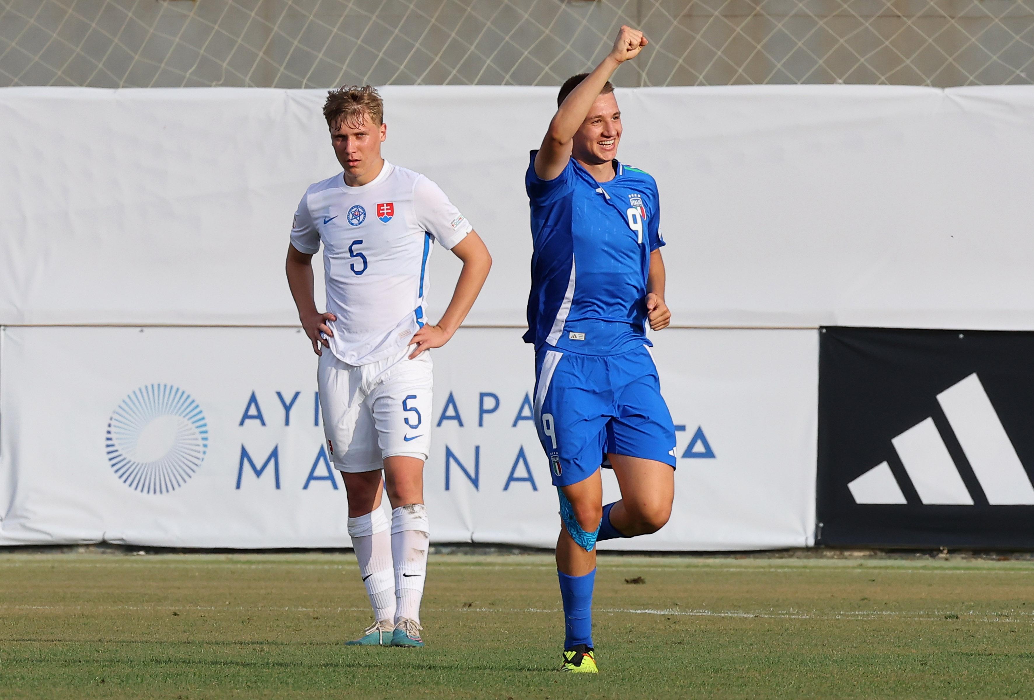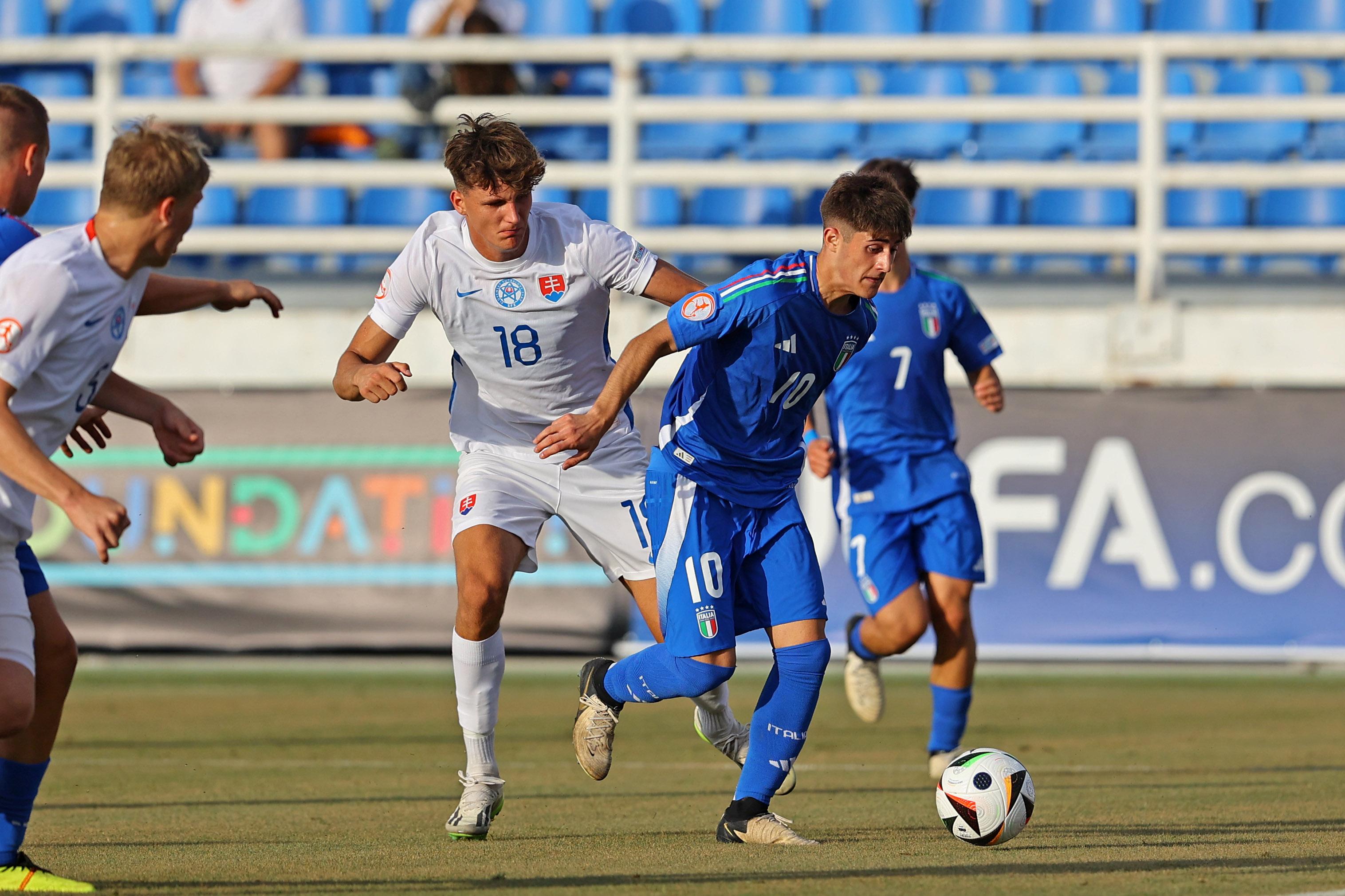 PARTITA. L'Italia inizia con il piede giusto e, dopo una conclusione di destro dai 20m di Mantini terminata di poco alta a lato alla destra, sfiora l'1-0 al 22': Garofalo esce in bello stile dalla difesa prima di servire lungo l'out mancino Mosconi, il quale s'invola palla al piede e, dal fondo, serve un preciso rasoterra al centro per Camarda che, di prima intenzione, calcia clamorosamente alto sopra la traversa con il sinistro. Alla mezz'ora, dopo una debole conclusione rasoterra con il mancino di Kováčik bloccata a terra da Longoni, il numero 9 azzurro decide di farsi perdonare il precedente errore sotto porta inventandosi un fendente di controbalzo ad incrociare, con il sinistro, che si infila nell'angolino basso alla destra non lasciando alcuno scampo a Zajac.