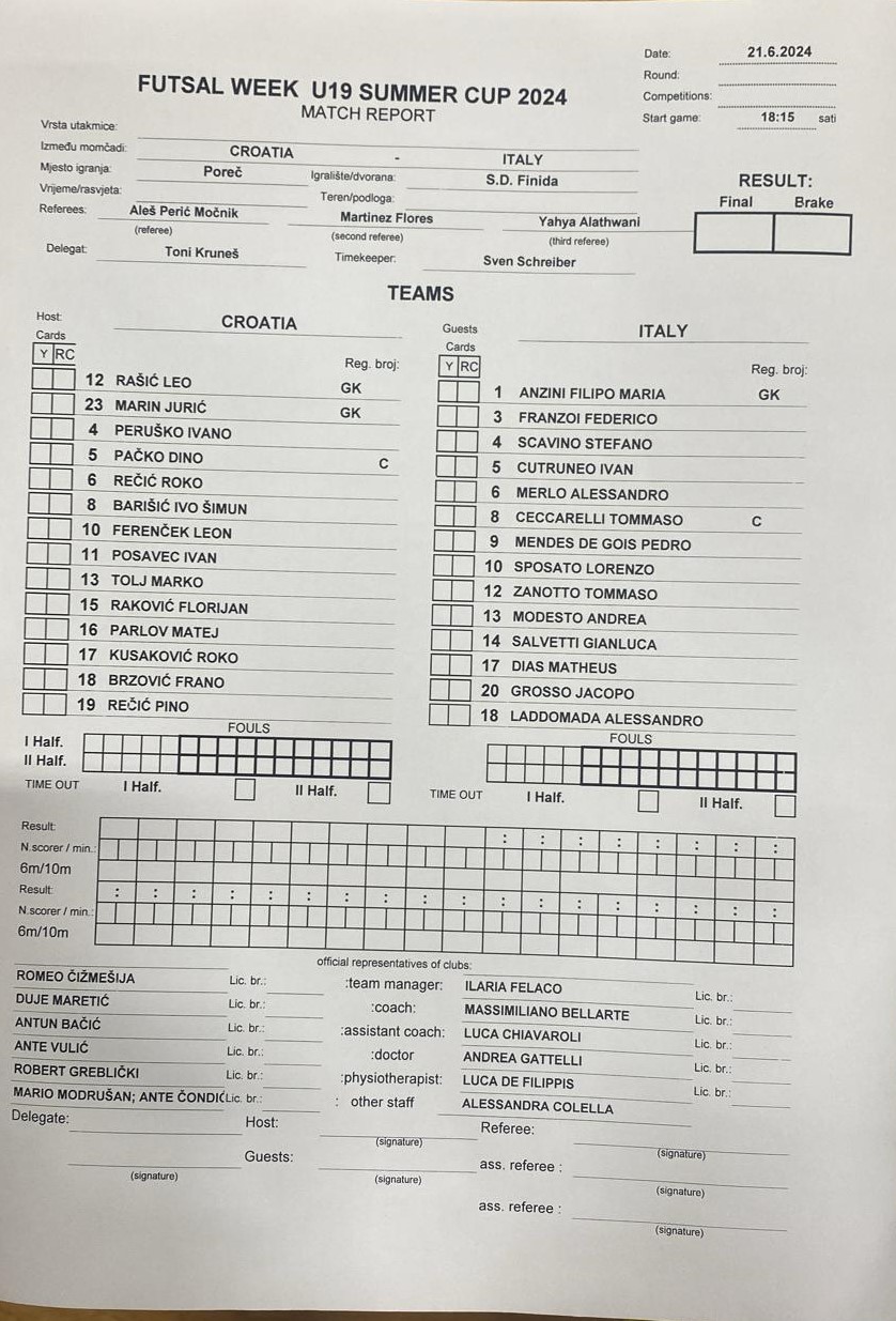 CRONACA. I primi minuti di gara sono abbastanza equilibrati, con entrambe le squadre che provano a pungere, senza però riuscire ad affondare il colpo. Superata la metà tempo la Croazia compie lo ‘strappo’: al 13’ Barisic realizza il gol dell’1-0, approfittando di un errore difensivo, poi due minuti più tardi è Parlov a punire la retroguardia degli Azzurrini con la rete del 2-0. Il doppio svantaggio manda in difficoltà l’Italia, che accusa il colpo e al minuto 18 subisce anche il 3-0 realizzato da Recic. L’avvio di ripresa è scoppiettante: nel giro di 2’ prima segna Cutruneo, poi Packo e un’autorete sfortunata di Grosso portano sul 5-1 i padroni di casa, infine ancora Cutruneo riaccende la speranza dell’Italia con il gol del 5-2. È un segnale, gli Azzurrini non mollano la presa sulla partita: al 7’ Grosso si procura un rigore che Ceccarelli trasforma e un minuto più tardi è ancora il capitano ad andare a segno con una deviazione volante in area di rigore che riapre definitivamente la partita. Il 5-4 regge a lungo finché Sposato non decide di caricarsi la squadra sulle spalle: i suoi isolamenti mandano in tilt la difesa croata e al 14’ da un suo uno contro uno nasce la splendida imbucata di Cutruneo per Grosso che realizza il 5-5. A due minuti e mezzo dalla fine, però, nonostante l’inerzia penda tutta a favore gli Azzurrini, la Croazia riesce ad avere un sussulto e trova il 6-5 con Posavec. È la rete che decide la partita, perché Bellarte inserisce il portiere di movimento, ma il risultato non cambia più.