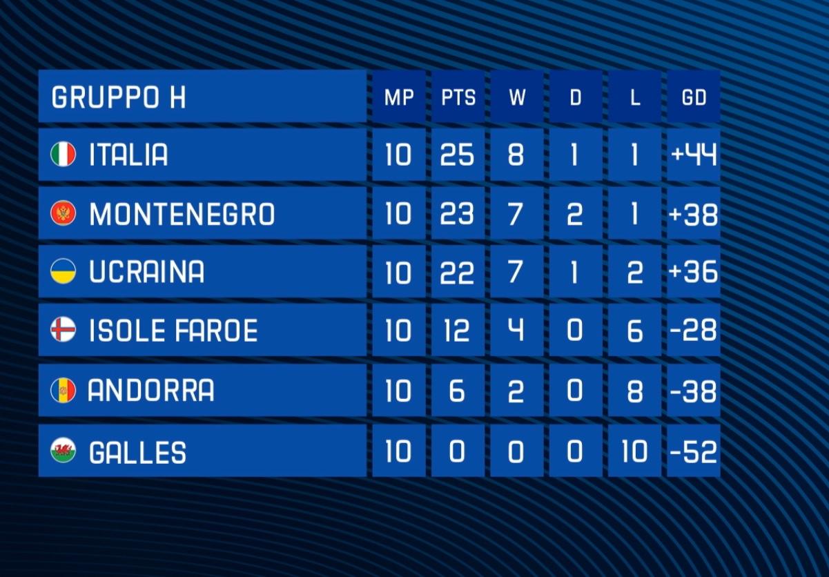Classifica: ITALIA 25 punti, Montenegro 23, Ucraina 22, Isola Faroe 12, Andorra 6, Galles 0