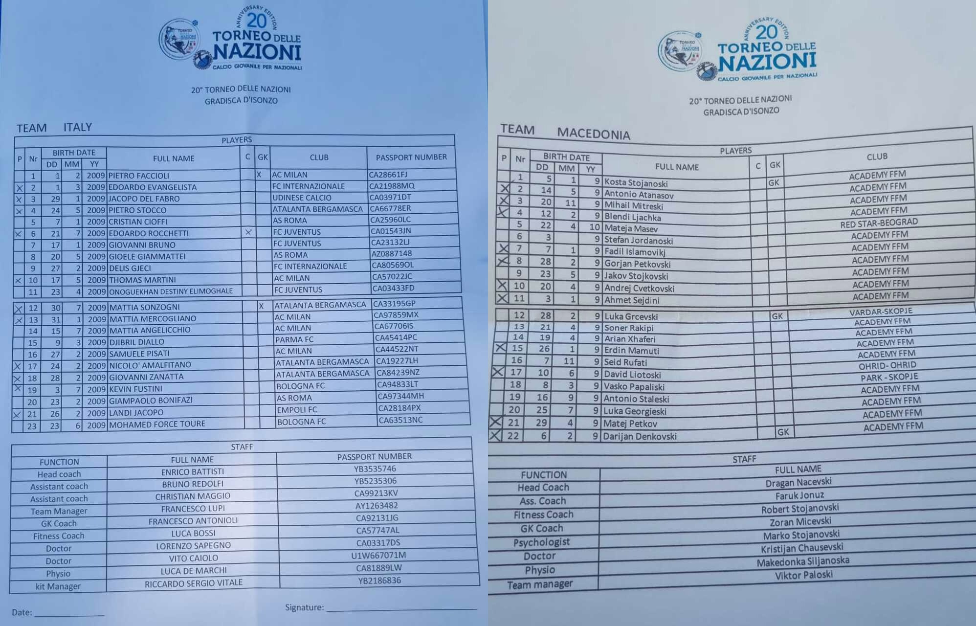 Termina con una bella vittoria il cammino nella 20ª edizione del Torneo delle Nazioni della Nazionale Under 15, che si è imposta 2-0 a Rivignano sui pari categoria della Macedonia del Nord aggiudicandosi la finale 5° posto. L'Italia passa in vantaggio al quarto d'ora del primo tempo grazie all'attaccante dell'Empoli Jacopo Landi prima di chiudere definitivamente i conti, ad inizio ripresa (38'), con lo juventino Giovanni Bruno, subentrato all'intervallo all'atalantino Nicolò Amalfitano.