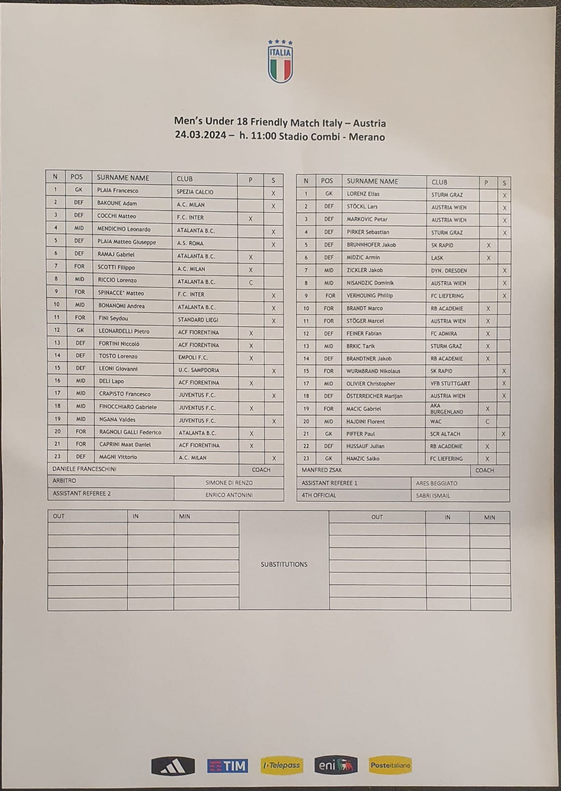 Altra ottima prova della Nazionale Under 18 che, ancora una volta al 'Gianpiero Combi' di Merano, s'impone 2-0 sui pari categoria dell'Austria, sconfitti 2-1 tre giorni fa. Gli Azzurrini, dopo aver sfiorato il vantaggio nel primo tempo con il milanista Filippo Scotti su cross dalla sinistra dell'interista classe 2007 Matteo Cocchi, trovano il gol dell'1-0 nella ripresa grazie a Maat Daniel Caprini (Fiorentina) che, al 54', ribadisce in rete una sua precedente conclusione respinta sulla linea da un difensore austriaco. La rete del raddoppio azzurro, invece, arriva circa un quarto d'ora dopo (68') con Seydou Fini (Standard Liegi) che approfitta di un errato retropassaggio di Jakob Brunnhofer per scavalcare con un preciso pallonetto l'estremo difensore avversario Salko Hamzić. L'ultima emozione della partita, a due giri d'orologio dalla fine, la regala l'atalantino Leonardo Mendicino, la cui conclusione rasoterra da fuori area si stampa sul palo negando il 3° gol all'Italia.