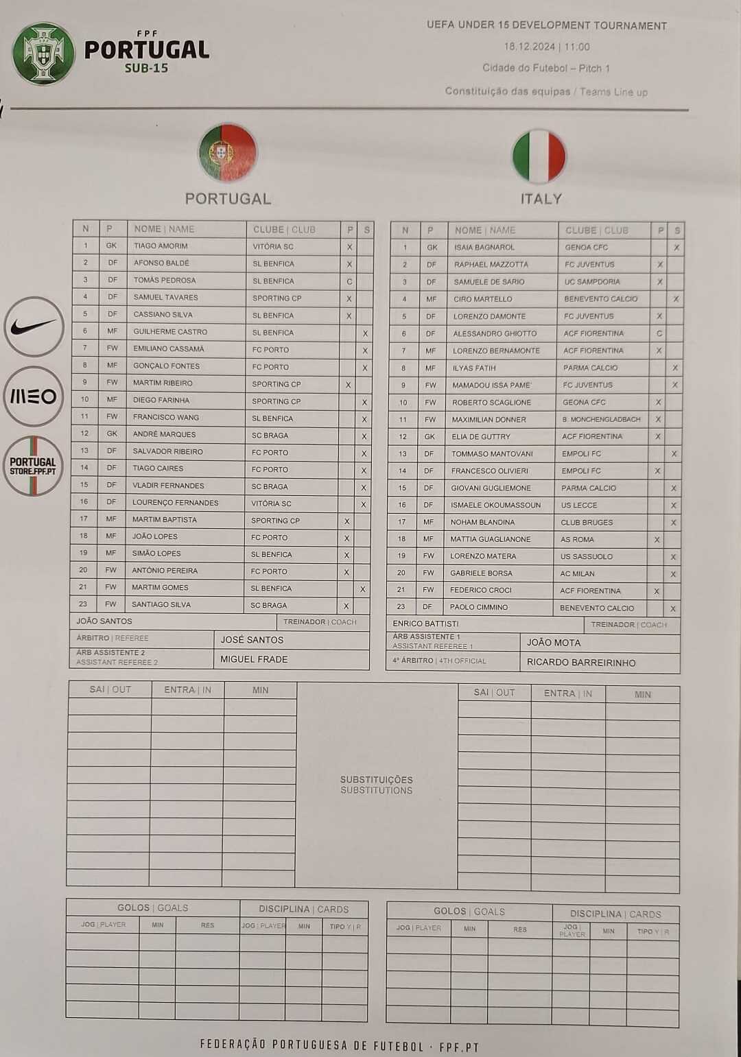 Grandissimo successo della Nazionale Under 15, che, grazie alla vittoria per 3-2 sui padroni di casa del Portogallo alla Cidade do Futebol di Algés, ha chiuso il Torneo di Sviluppo UEFA al primo posto con 7 punti. Gli Azzurrini hanno sbloccato il risultato al 5' grazie al trequartista del Genoa, Roberto Scaglione, per poi raddoppiare al 48' con Federico Croci, attaccante della Fiorentina. Al 64', la formazione di Enrico Battisti si è portata sul 3-0 grazie, ancora una volta, al suo numero 10 Scaglione. Nel finale, il Portogallo ha accorciato le distanze, prima con Emiliano Cassamá al 78' e poi con Tiago Caires al 90'+4, entrambi in forza al Porto.