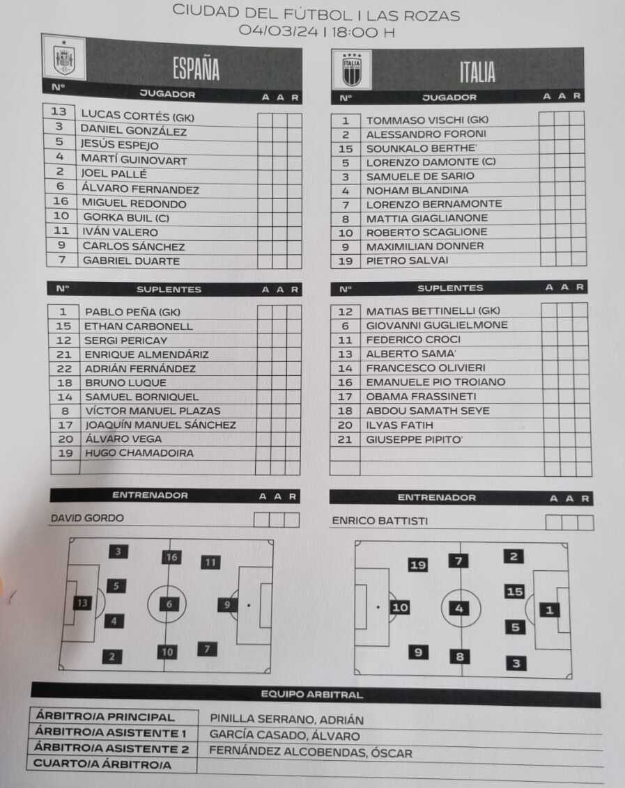 PARTITA. L'Italia scende in campo con il 4-3-1-2, con Scaglione a supporto della coppia d'attacco formata da Salvai e Donner. La Spagna risponde con il 4-3-3, con il tridente offensivo composto da Gabi Duarte, Carlos Sánchez e Iván Valero.
