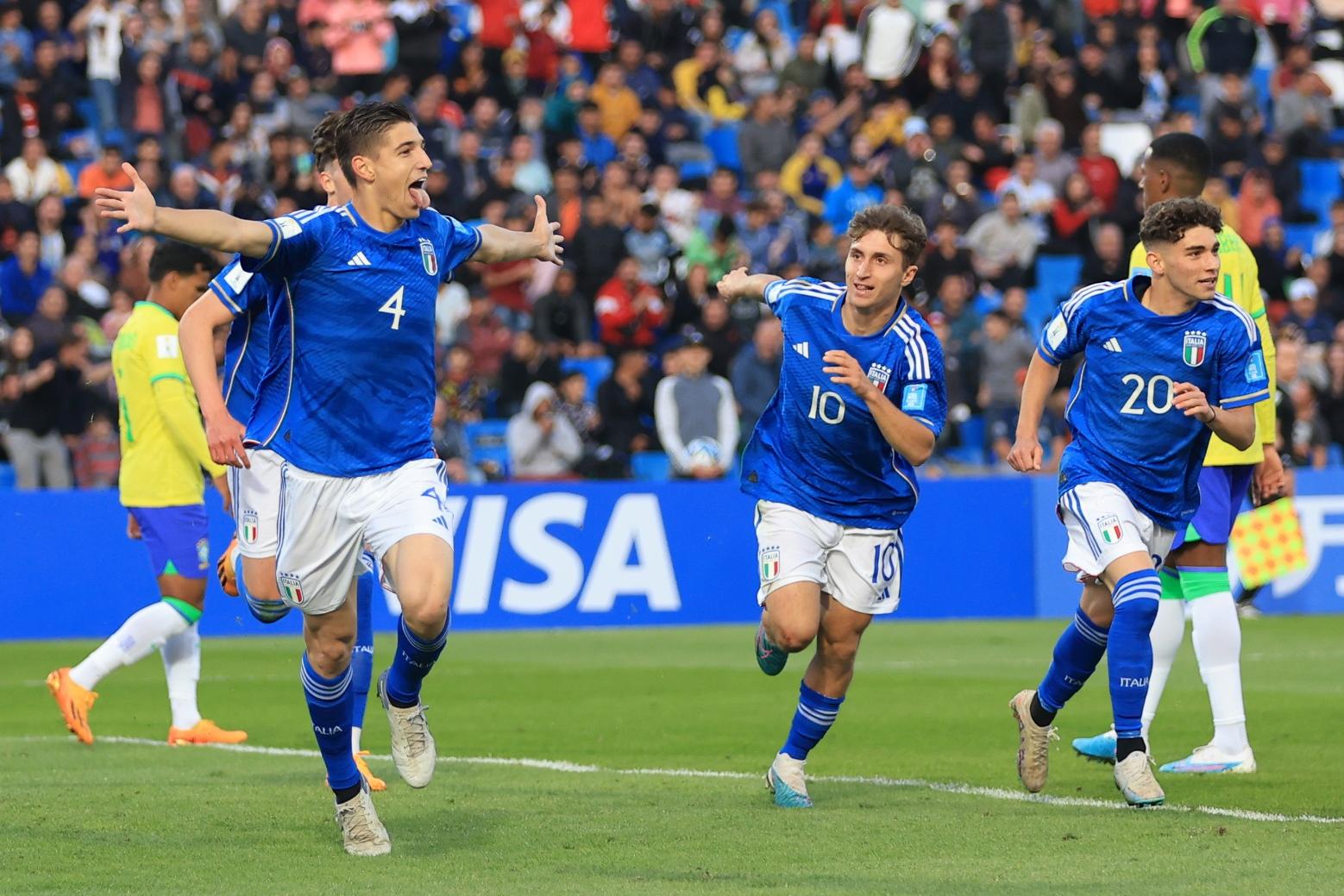 Il tecnico Azzurro schiera il 4-3-1-2, con la linea difensiva formata da Zanotti a destra, Ghilardi e Guarino centrali, Turicchia a sinistra; Faticanti davanti alla difesa, Prati e Casadei mezzali; Baldanzi vertice alto del rombo, Pafundi a destra ed Esposito a sinistra. Nessun timore reverenziale, gli Azzurrini contrastano le prime folate brasiliane, mantengono le distanze tra i reparti, ottimo il palleggio La prima occasione è per l’Italia al 6’ con una punizione concessa dall’arbitro al limite dell’area brasiliana: si incarica del tiro Casadei, che manda di poco alto sulla traversa. Al 12’ il vantaggio dell’Italia. Un azione che parte dalla trequarti verdeoro, Pafundi recupera un pallone e serve Turicchia, che mette al centro dell’area per la testa di Casadei, la sua deviazione raggiunge Prati che di destro non ci pensa due volte e spara la palla sotto la traversa. Il secondo gol al 28' quando Baldanzi batte un calcio d'angolo imbeccando Casadei, che di testa insacca. Al 33’ il terzo gol: Baldanzi parte da centrocampo, una galoppata fino dentro l’area avversaria, serve Casadei che viene falciato da Marlon Gomes, l’arbitro messicano Ortiz Nava non ha dubbi, rigore: se ne occupa il centrocampiste del Reading, che a mezza altezza, sulla sinistra, fulmina Mycael.