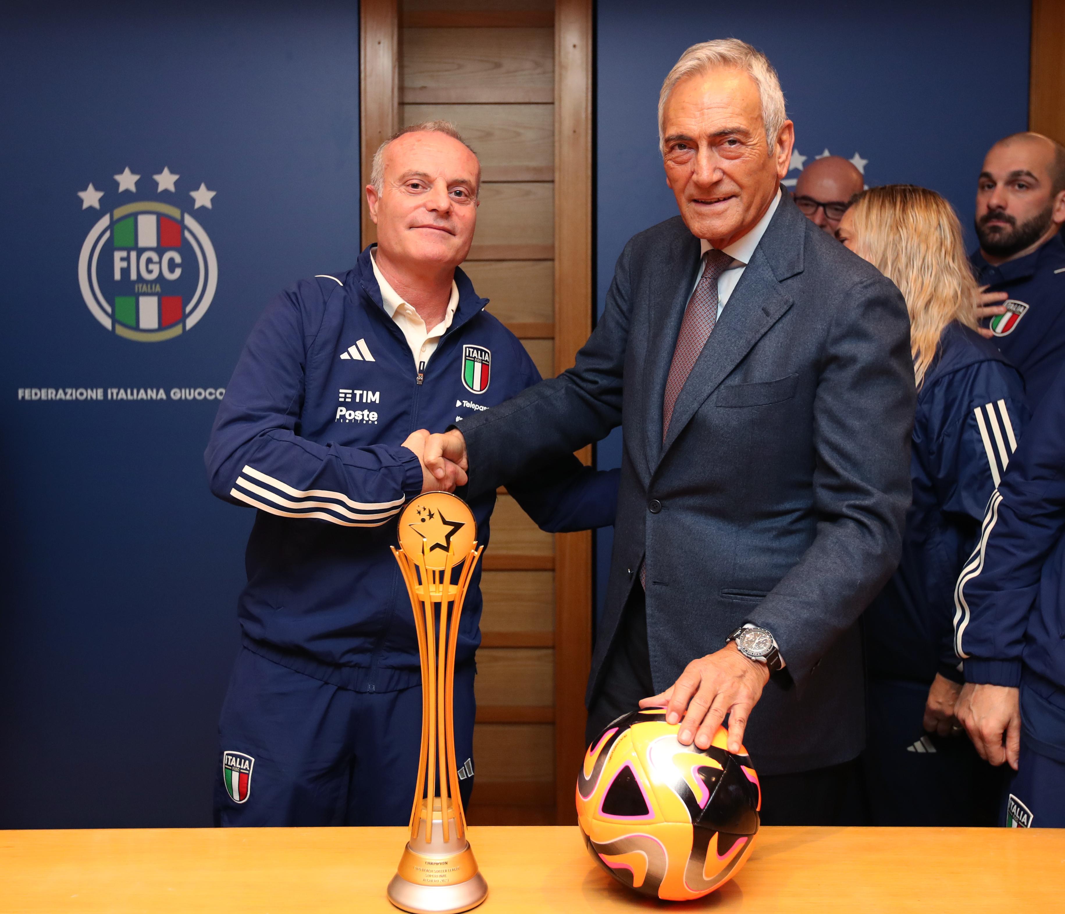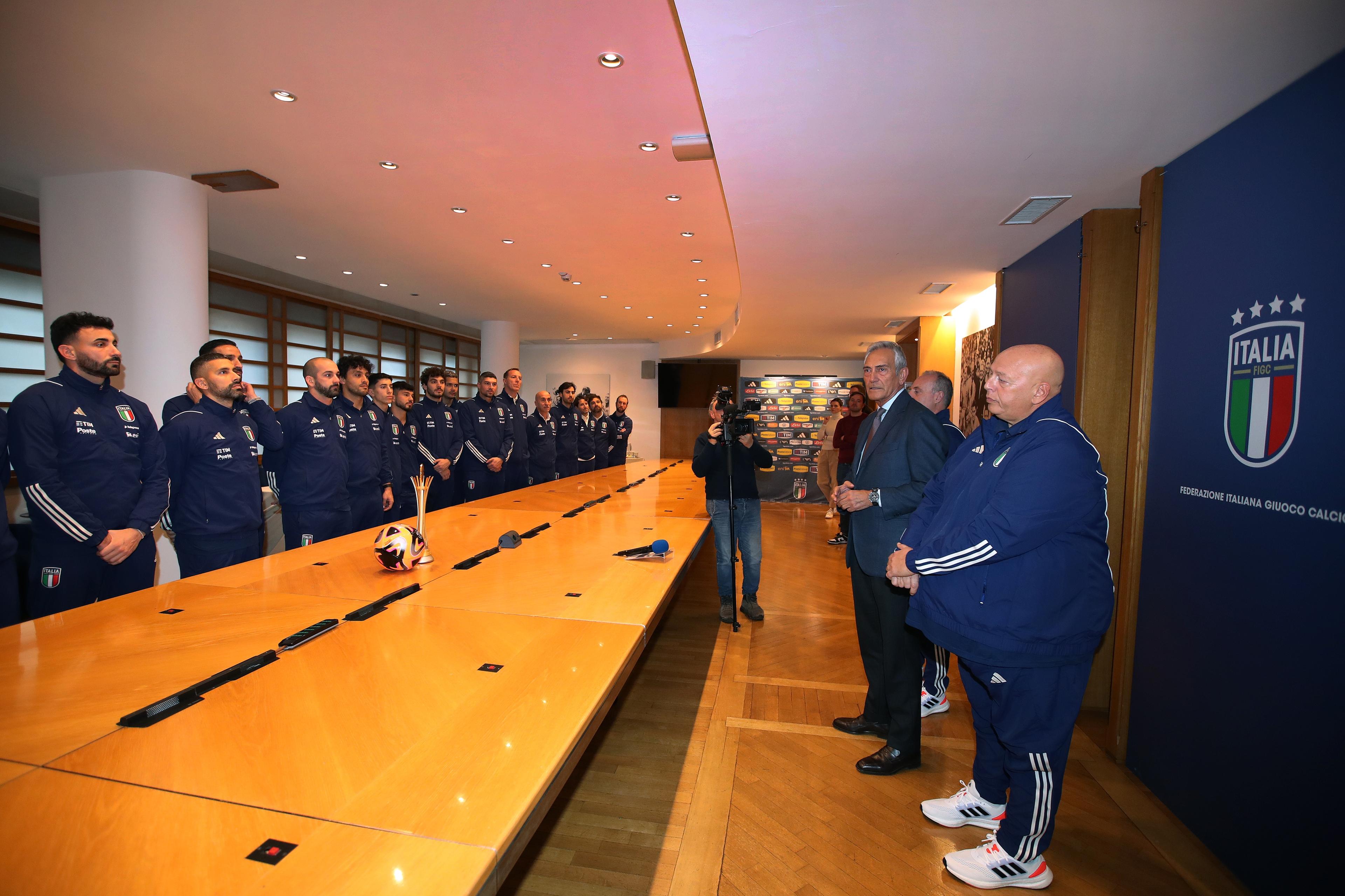 A meno di un mese dall’esordio nella 12a edizione della Coppa del Mondo di beach soccer (Italia-USA il 15 febbraio), la Nazionale di Emiliano Del Duca è stata ricevuta questo pomeriggio dal presidente della FIGC Gabriele Gravina. A via Allegri, oltre a celebrare la vittoria dello scorso Europeo – il terzo della storia dopo i successi del 2005 e 2018 – il presidente ha voluto rivolgere il suo in bocca al lupo a Zurlo e compagni.