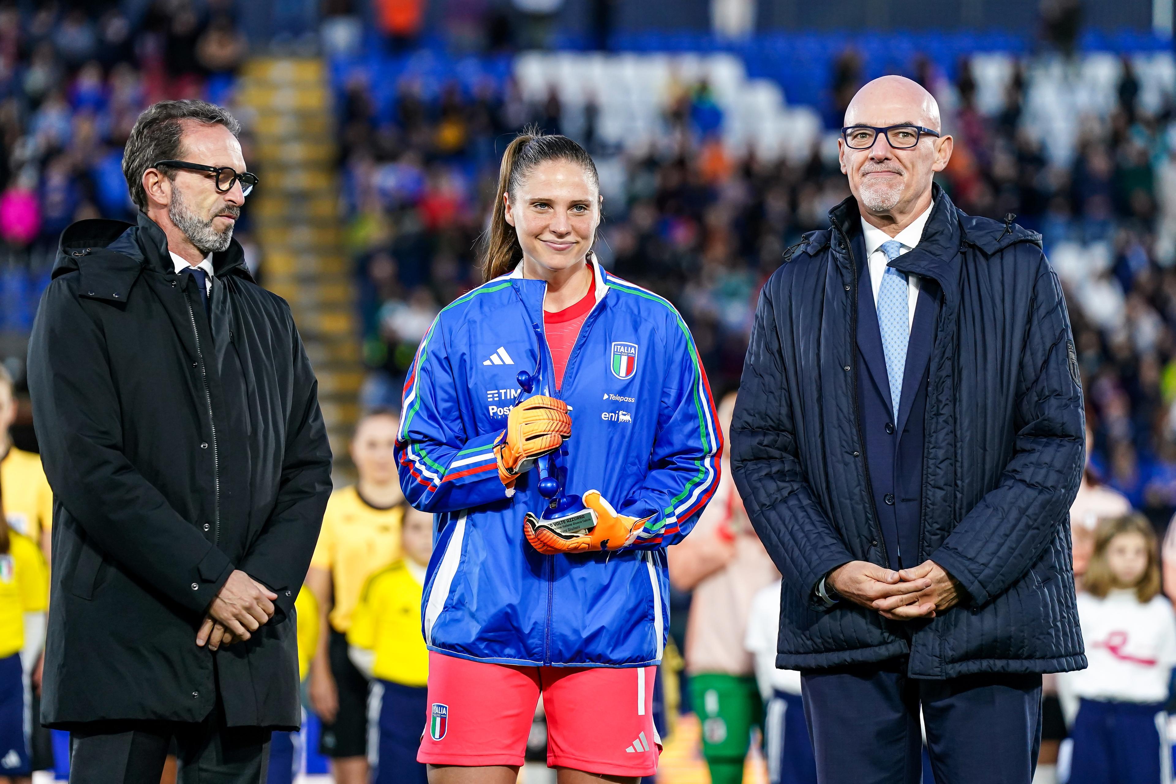 Dopo la dedica a Serturini (alle prese con la riabilitazione post operazione al crociato) durante la foto di squadra, i primi applausi della serata sono tutti per la numero 1 dell’Italia, entrata a luglio nel ristrettissimo club delle ‘centenarie’ di cui fanno parte anche Linari, Bonansea e Girelli. Prima del calcio d’inizio il portiere del Milan è stato premiato, sotto gli occhi delle sue compagne di club, dal presidente dell’AIC e vicepresidente vicario della Federazione Umberto Calcagno e dal segretario generale della FIGC Marco Brunelli. La gara si apre con una seconda standing ovation e a meritarla questa volta è Corelli, che al 3’ sfiora il suo primo centro con la maglia dell’Italia, ma il piattone della 21enne romana viene deviato in corner da Yamashita. L’estremo difensore del Manchester City si ripete alla metà della prima frazione di gioco respingendo con un gran riflesso la conclusione a botta quasi sicura della ‘diez’ italiana, mentre il Giappone si rende pericoloso al 45’ con lo scavetto di Seike terminato sull’esterno della rete, ultima emozione di un primo tempo molto equilibrato.