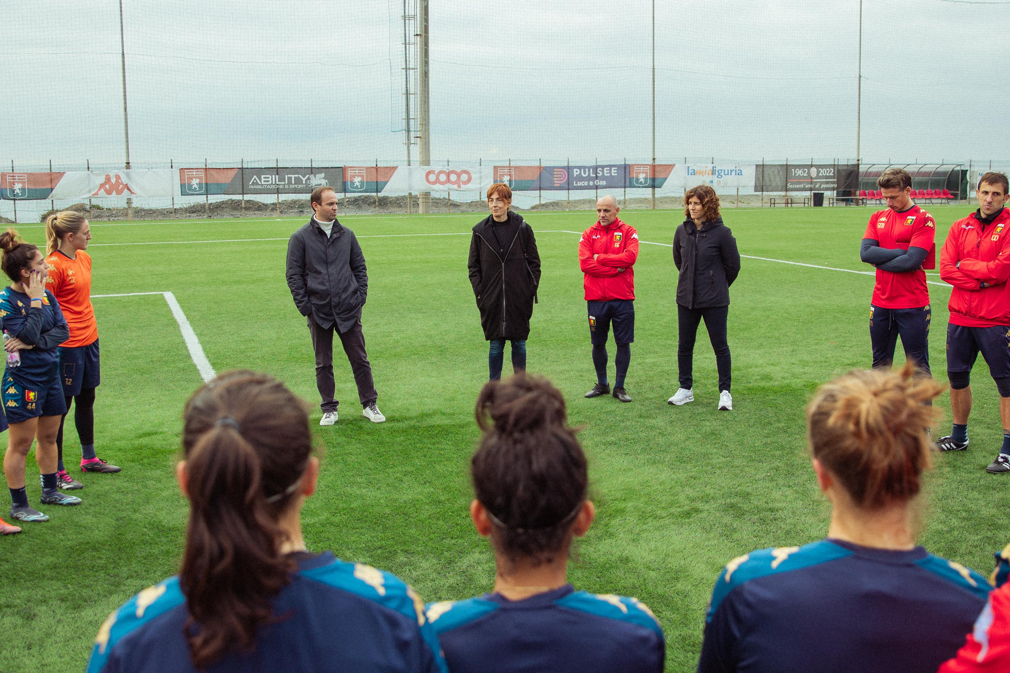 Ad accogliere Grilli e Matteucci, tra gli altri, Marta Carissimi, responsabile del settore femminile del Genoa ed ex calciatrice della Nazionale, e l'allenatore Antonio Filippini.
