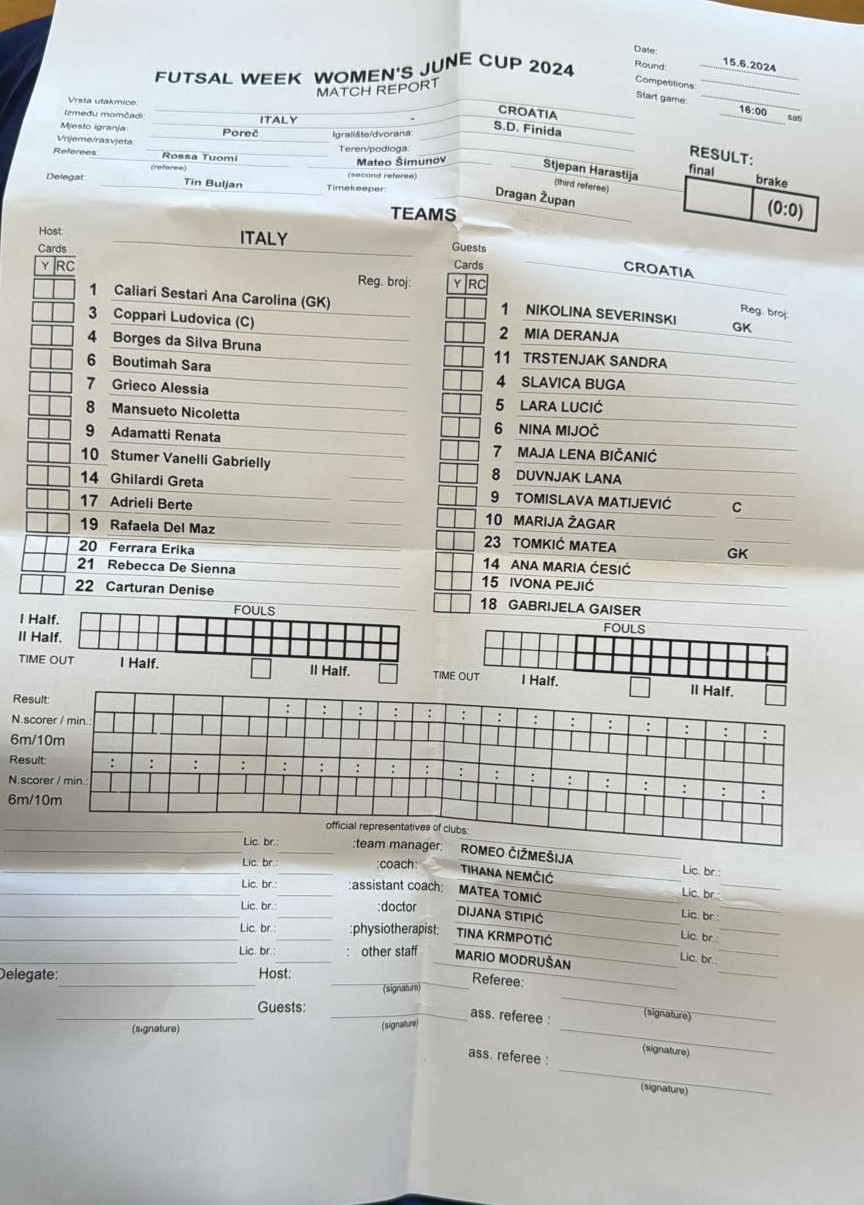 LA CRONACA. Dopo appena 14’’ Boutimah sblocca la partita: l’attaccante marchigiana è la più rapida di tutte nel riciclare un pallone all’interno dell’area di rigore, rimasto senza padrone dopo il tiro di capitan Coppari respinto dal palo. L’avvio azzurro è entusiasmante: passa un solo giro di lancette quando Adamatti, dopo una serie ubriacante di doppi passi, spara una sassata sotto la traversa per il 2-0. L’Italia è in fiducia e anche il ‘secondo’ quartetto di movimento fa subito male alla Croazia: al 6’ Dal’Maz lancia nello spazio Grieco che in allungo, scivolando sul parquet, batte Severinski. Sopra 3-0 le ragazze allenate da Salvatore non si accontentano e al minuto 11 volano trovando la quarta rete: Vanelli inventa, imbuca centralmente per Coppari ‘spaccando’ in due la difesa croata; ne nasce un 3vs2, con la stessa Coppari che premia l’appoggio di Boutimah, mettendola sola davanti al portiere per il 4-0. Il primo tempo si chiude con un nettissimo 5-0, anche perché al 18’ arriva l’autorete di Duvnjak sugli sviluppi di un calcio d’angolo. Al 4’ del secondo tempo Grieco segna la doppietta personale: ben servita da Ferrara buca fra le gambe il portiere croato trovando il 6-0. Mezzo minuto più tardi c’è nuovamente gloria per Adamatti che chiude un’azione personale con la settima marcatura azzurra. Dopo una lunga fase infruttuosa di portiere di movimento della Croazia, a 3’ dalla fine arrivano il gol della bandiera siglato dalla numero 4 Slavica e il definitivo 7-2 di Lucic.