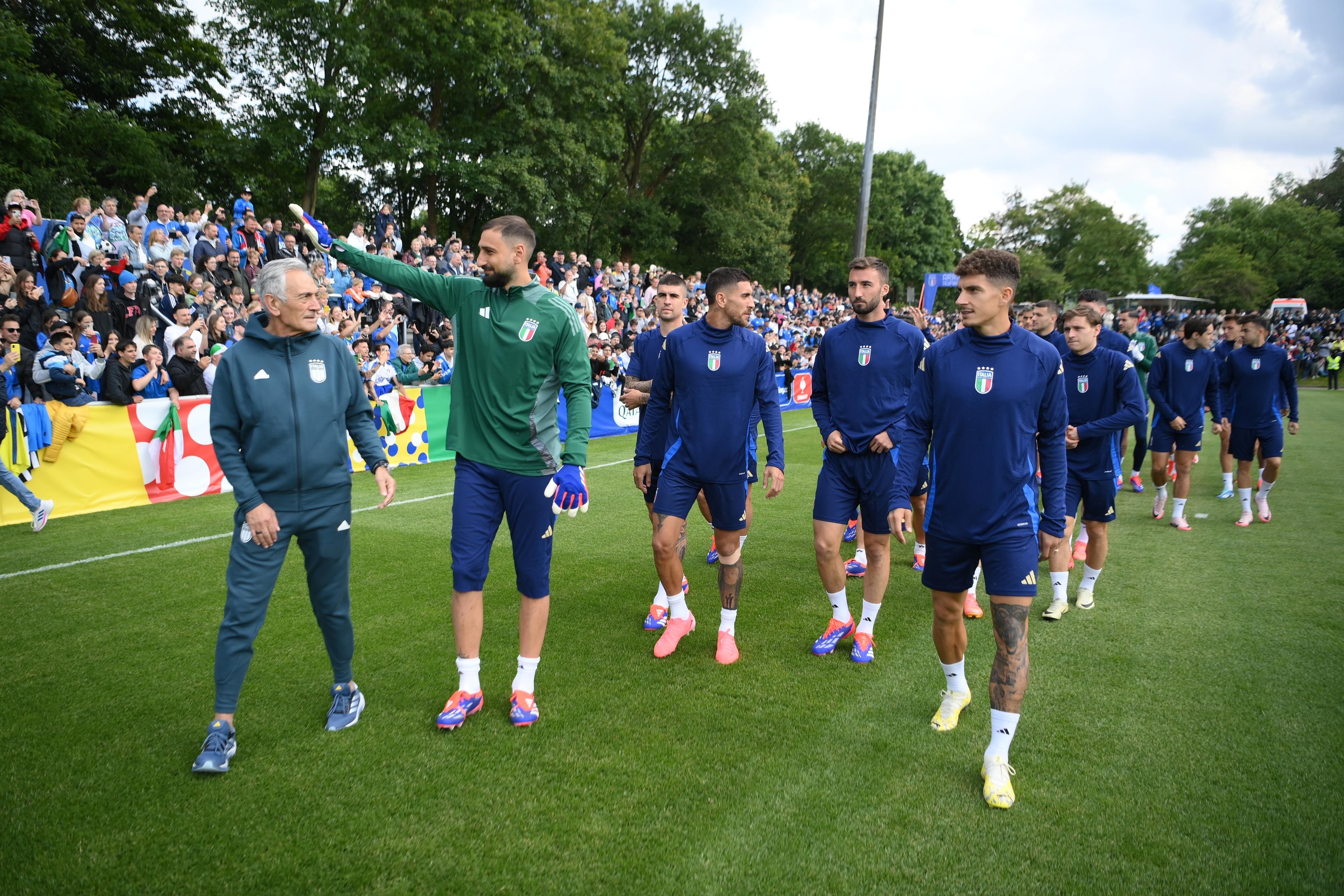 Il Ct Luciano Spalletti e il presidente della FIGC Gabriele Gravina hanno anticipato di qualche metro l'ingresso in campo dei giocatori, e di uno che giocatore lo è stato e che è stato tra gli eroi di Germania 2006. Un boato, quello che ha accolto Gigi Buffon, oggi capodelegazione della Nazionale campione d'Europa. Ma ovazione per tutti: da chi era a Wembley nel 2021 a chi giocherà il primo Europeo della sua carriera.