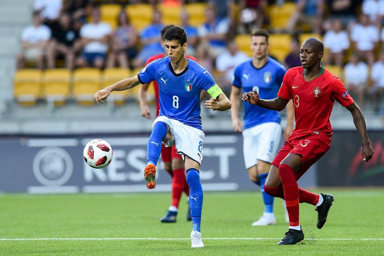 Con un pressing molto alto e l’imprevedibilità dei suoi esterni, il Portogallo crea serie difficoltà all’Italia, che si fa sorprendere dalle ripartenze dell’asse Vinagre-Joao Felipe. Ma al 29’ la squadra di Nicolato, su una ripartenza, chiama in causa Joao Virginia, costretto a deviare in angolo un insidioso tiro di Frattesi. Quattro minuti più tardi un assist di prima intenzione di Tonali serve Pinamonti, che colpisce di testa, ma il tiro finisce alto. Poi al 42’ è proprio Tonali a mettere in difficoltà i portoghesi con una punizione, pronta però la respinta di Virginia. Partita incredibile, neanche il