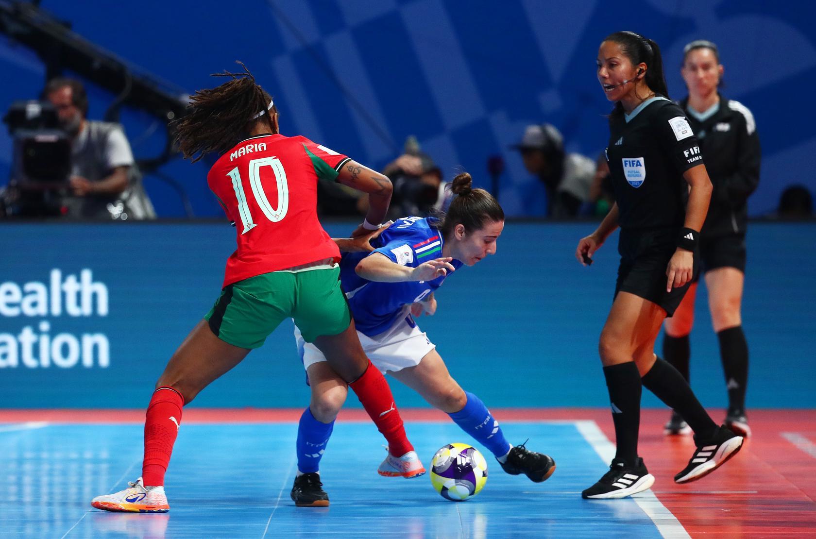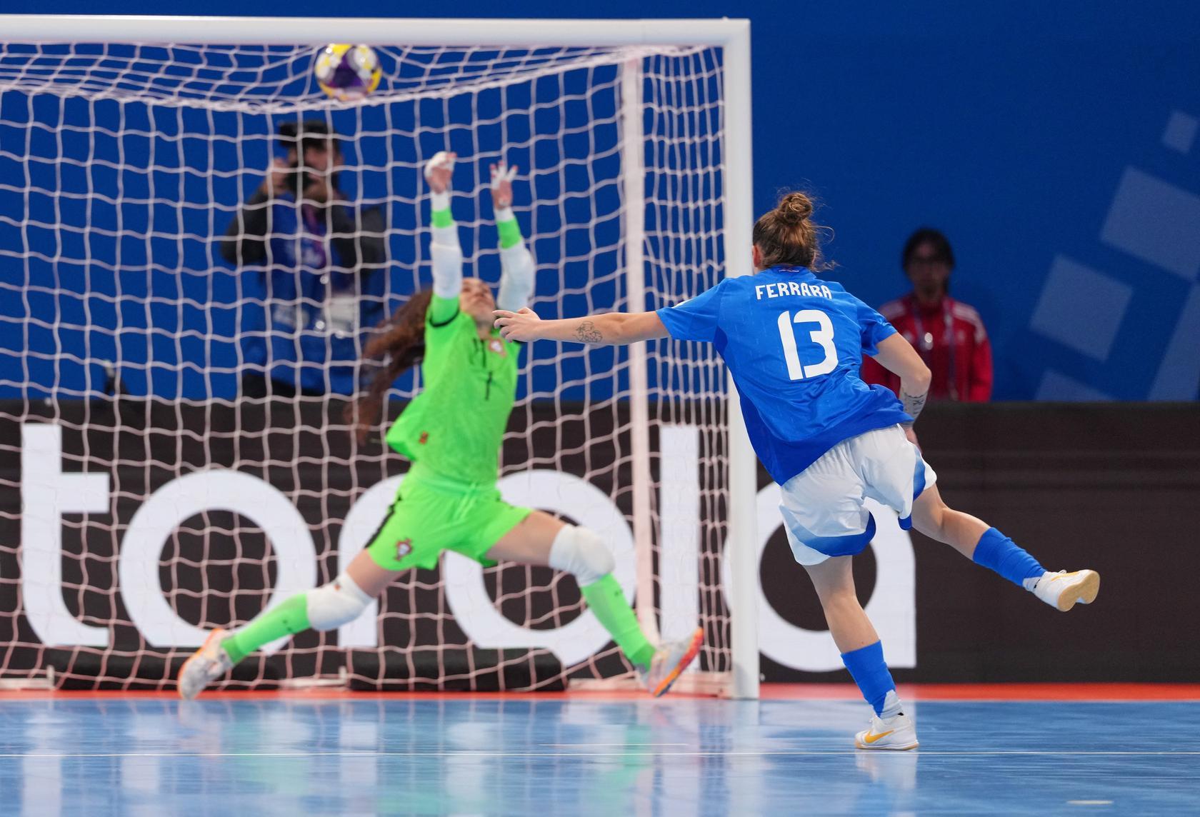 Sotto 2-0 senza di fatto aver subito azioni pericolose, l’Italia si rimette a macinare gioco e lo fa anche bene: a metà tempo su un tiro di Adamatti la panchina azzurra chiama il Video Support per un sospetto fallo di mani che viene confermato dalle arbitre venezuelane. Dal dischetto va Ferrara che con un mancino fortissimo segna il 2-1 che rimette dentro la partita l’Italia al 10’. Subìto il gol, il Portogallo accelera d’incanto e sfiora a più riprese il 3-1: ci va a un passo Kakà al minuto 11, ma la numero 4 liscia incredibilmente a porta completamente vuota. Anche Adamatti ha una chance con il suo sinistro, ma il mancino di ribattuta nel cuore dell’area di rigore si alza di un nulla oltre la traversa. Il match vive di una fase di equilibrio, anche se l’Italia prima chiama di nuovo il VS per un’uscita in ritardo di Ana Catarina su Vanelli che non viene valutata da cartellino rosso e poi protesta vivacemente per un fallo di mano in area di rigore di Fifò non fischiato. Le occasioni nel finale arrivano da entrambe le parti in un match bello ed equilibrato, ma all’intervallo è 2-1 per il Portogallo nonostante un’ottima prova delle Azzurre.
