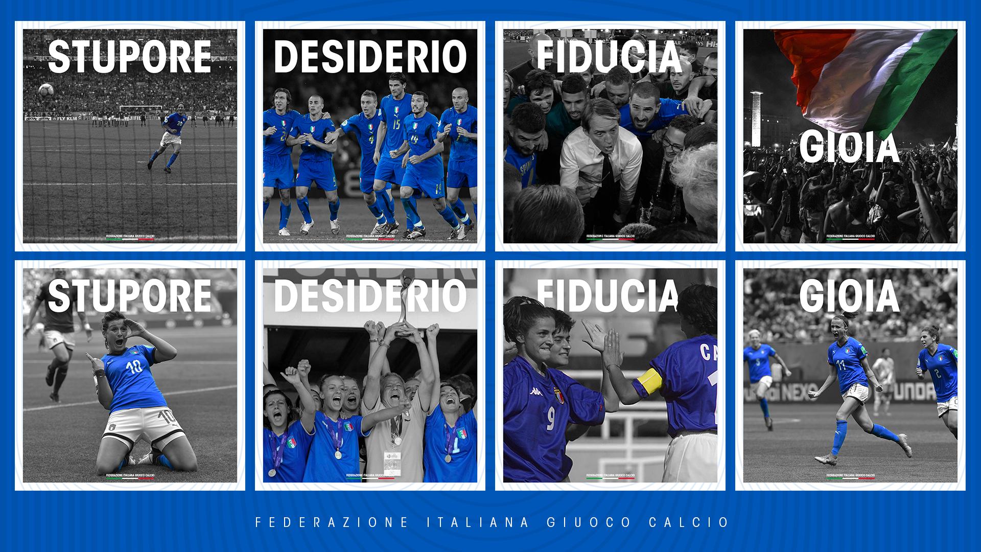 Per il lancio del logo, nei giorni scorsi, i profili social della FIGC hanno messo in risalto alcune emozioni abbinate a immagini simbolo della storia della Nazionale: il desiderio, come quello che ha portato gli Azzurri alla vittoria nel mondiale del 2006; la fiducia, come quella di un allenatore e di un gruppo protagonista del trionfo all’Europeo 2020; lo stupore, come quello unanime per il 'cucchiaio' di Totti nel 2000; e infine la gioia, quella di un intero paese in festa, come ogni volta che gli Azzurri alzano al cielo una Coppa. Le stesse emozioni sono state declinate sui profili social delle Nazionali Femminili abbinate in questo caso alla storia delle Azzurre: lo stupore di Girelli dopo il gol alla Giamaica nel Mondiale 2019; la gioia di Bonansea dopo la doppietta all’esordio con l’Australia nello stesso torneo; il desiderio delle ragazze dell’Under 19 che nel 2009 hanno conquistato l’unico trofeo internazionale delle Azzurre, l’Europeo di categoria; la fiducia di Panico in gol con la Germania al Mondiale 1999 nel suo sguardo verso Carta, a simboleggiare tutte le generazioni delle calciatrici che hanno fatto la storia del calcio femminile italiano.