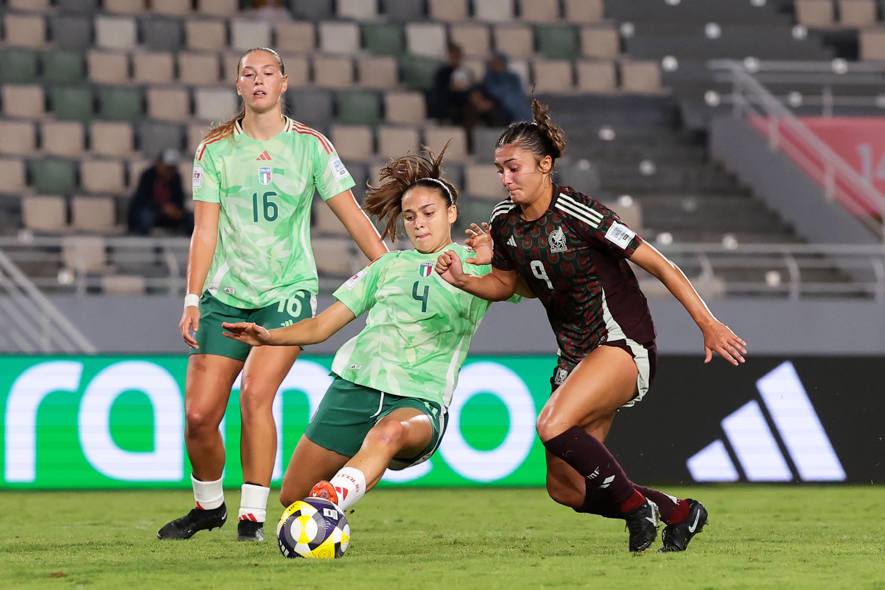 Rispetto all’altra gara disputata allo Stadio Olimpico di Rabat, quella con le padrone di casa del Marocco nel girone eliminatorio, gli spalti sono quasi vuoti e sulle tribune rimbombano le indicazioni dei due allenatori. La posta in palio impone la massima attenzione in tutte le situazioni di gioco e così la partita si sviluppa su binari tattici che imbrigliano le capacità offensive delle due squadre. È il 15’ quando nel momento migliore dell’Italia un tiro da lontano di Reyes viene rimpallato, con la sfera che carambola dalle parti di Stack, bravissima a incrociare con l’esterno dal limite dell’area e a battere Robbioni. La panchina azzurra si gioca però il cartellino del Football Video Support per un precedente contatto nell’area messicana con Copelli che viene toccata nel tentativo di uno contro uno prima del contropiede avversario. L’arbitro cambia decisione, assegna il penalty alle Azzurrine e di conseguenza annulla la rete: la svolta è clamorosa ma la partita non cambia completamente volto perché il portiere Murrieta riesce a opporsi al tentativo di Giudici dagli undici metri, mantenendo così la sfida sullo zero a zero. Al 37’ le Azzurrine hanno un’altra clamorosa occasione per trovare il vantaggio, con un nuovo calcio di rigore a favore: Galli si presenta dagli undici metri dopo aver conquistato la massima punizione, ma ancora una volta Murrieta è fenomenale a opporsi al tentativo. Si chiude così a reti bianche una prima frazione che trova pochi precedenti e che lascia decisamente l’amaro in bocca per il suo sviluppo.