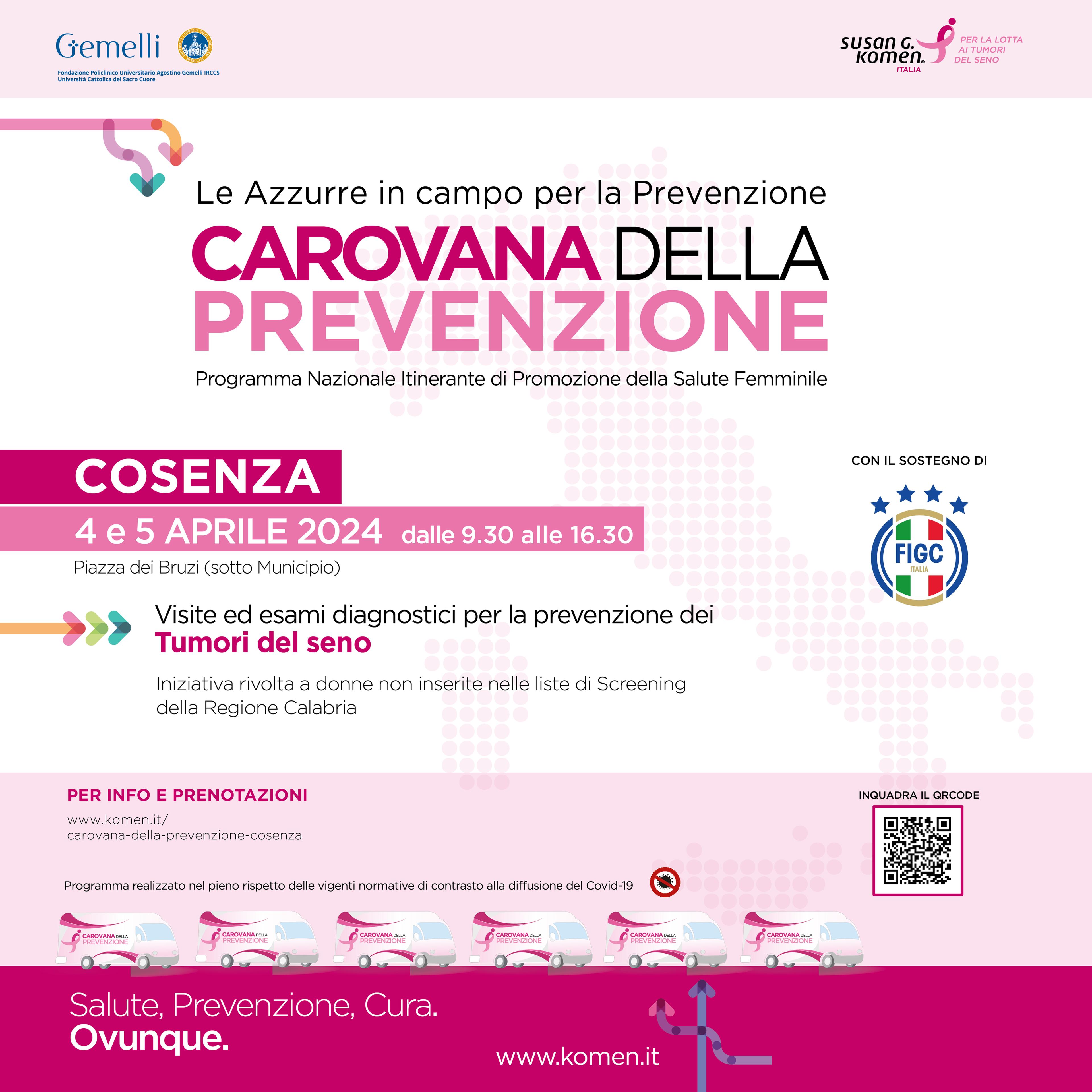 La tappa della Carovana della Prevenzione – che ha ricevuto il patrocinio dal Comune di Cosenza - combacia inoltre con un appuntamento sportivo molto importante: il 5 aprile alle 18.15 lo stadio ‘San Vito-Gigi Marulla’ di Cosenza ospiterà la prima partita della Nazionale Femminile nelle qualificazioni a EURO 2025, che vedrà le Azzurre scendere in campo per sfidare i Paesi Bassi.