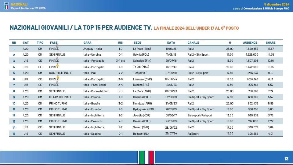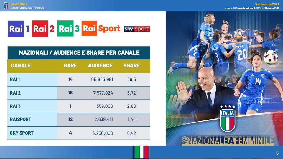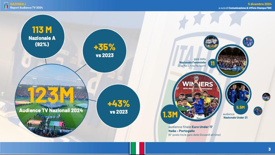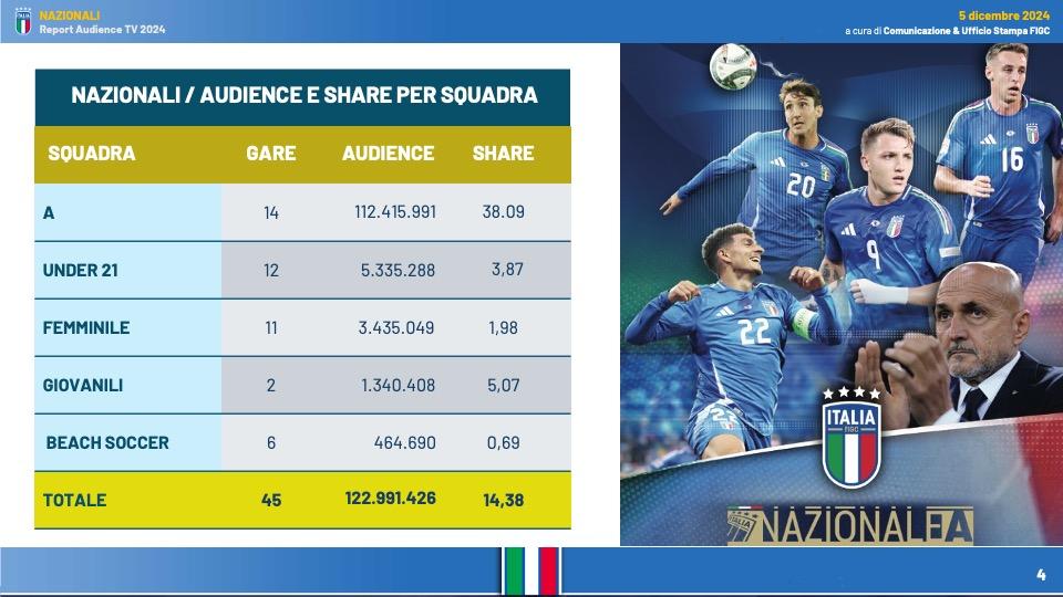 Il dato complessivo comprende le gare di 6 Nazionali: le maschili A, Under 21, Under 19, Under 17 e Beach Soccer, e la A femminile e i dati sono tra loro molto disomogenei: basti pensare che il 92& totale dei telespettatori arriva dalle 14 partite degli Azzurri, che raggiungono i 113 milioni di telespettatori (8 milioni di media) con il 38,09% di share in media, dal 73,4% di Italia – Svizzera a Euro 2024 (tra Rai 1 e Sky Sport) al 22,6% dell’amichevole Italia – Bosnia alla vigilia del torneo continentale. Le altre squadre si dividono circa 10 milioni di telespettatori: guida l’Under 21 con 5.3M e 3,87 media share in 12 gare (11 su Rai 2, 1 su RaiSport); seguono la A Femminile (3.4M / 1,98%) in 11 partite (7 su Rai 2 e 4 su RaiSport); le due gare dell’Under 17 (Finale Europeo) su Rai 3 e dell’Under 19 (Semifinale Europeo) su RaiSport con 1.3M e oltre il 5% di media share; la Nazionale di Beach Soccer, trasmessa su RaiSport in occasione del Mondiale a Dubai a febbraio (circa 500mila telespettatori, 0,7% share medio).