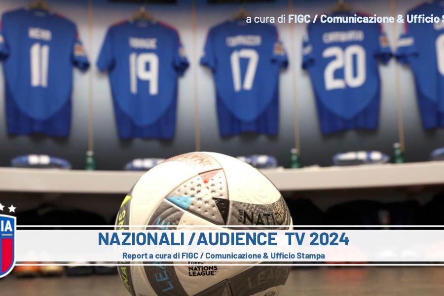 Il dato complessivo comprende le gare di 6 Nazionali: le maschili A, Under 21, Under 19, Under 17 e Beach Soccer, e la A femminile e i dati sono tra loro molto disomogenei: basti pensare che il 92& totale dei telespettatori arriva dalle 14 partite degli Azzurri, che raggiungono i 113 milioni di telespettatori (8 milioni di media) con il 38,09% di share in media, dal 73,4% di Italia – Svizzera a Euro 2024 (tra Rai 1 e Sky Sport) al 22,6% dell’amichevole Italia – Bosnia alla vigilia del torneo continentale. Le altre squadre si dividono circa 10 milioni di telespettatori: guida l’Under 21 con 5.3M e 3,87 media share in 12 gare (11 su Rai 2, 1 su RaiSport); seguono la A Femminile (3.4M / 1,98%) in 11 partite (7 su Rai 2 e 4 su RaiSport); le due gare dell’Under 17 (Finale Europeo) su Rai 3 e dell’Under 19 (Semifinale Europeo) su RaiSport con 1.3M e oltre il 5% di media share; la Nazionale di Beach Soccer, trasmessa su RaiSport in occasione del Mondiale a Dubai a febbraio (circa 500mila telespettatori, 0,7% share medio).