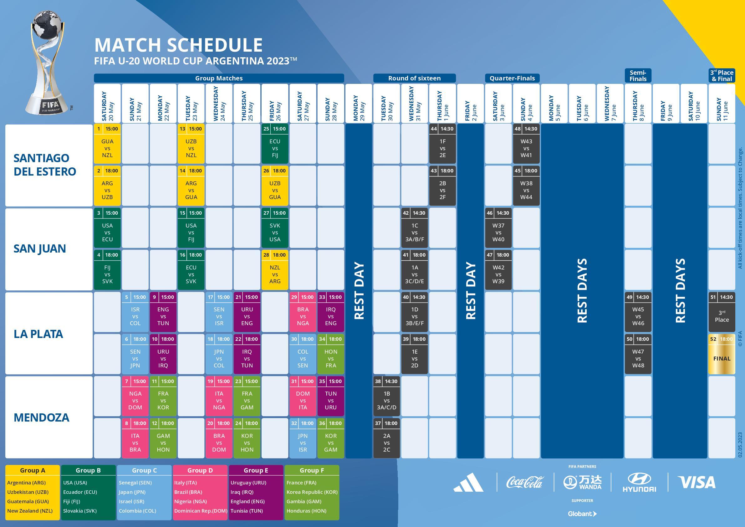 Mercoledì 24 maggio, altro doppio appuntamento: alle 17 Slovenia-Italia Under 17 da Telki, alle 20 Italia-Nigeria Under 20 da Mendoza. La terza e ultima gara della fase a gironi degli Azzurrini di Nunziata si giocherà, infine, sabato 27 sempre alle 20 ore italiane contro la Repubblica Dominicana. Agli ottavi di finale del Mondiale accederanno le prime due di ciascuno dei sei gironi più le quattro migliori terze. La finale si giocherà domenica 11 giugno a La Plata.